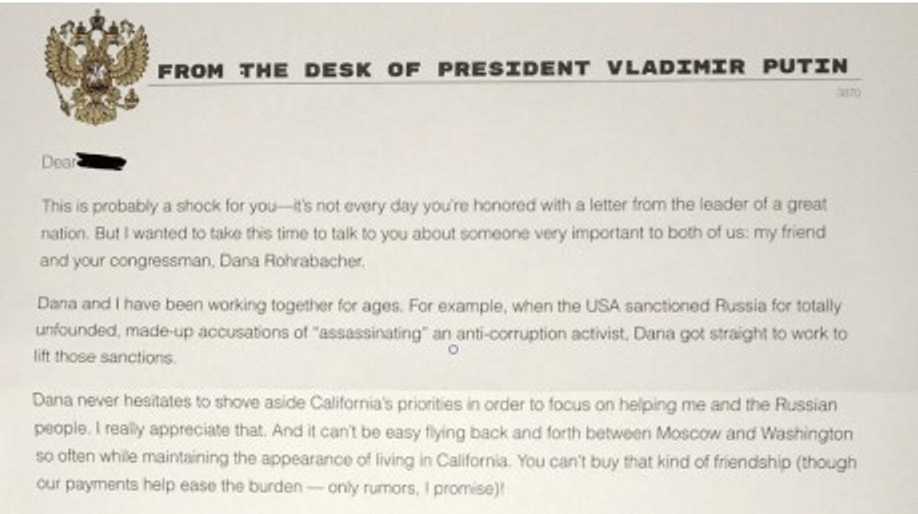 Текст письма представляет собой язвительный памфлет, направленный против одного из немногих открыто пророссийских американских политиков, выступавшего, в частности, за признание аннексии Крыма и против закона Магнитского. Дейна Рорабейкер — конгрессмен-республиканец от Калифорнии, ему предстоит переизбрание на ближайших промежуточных выборах.