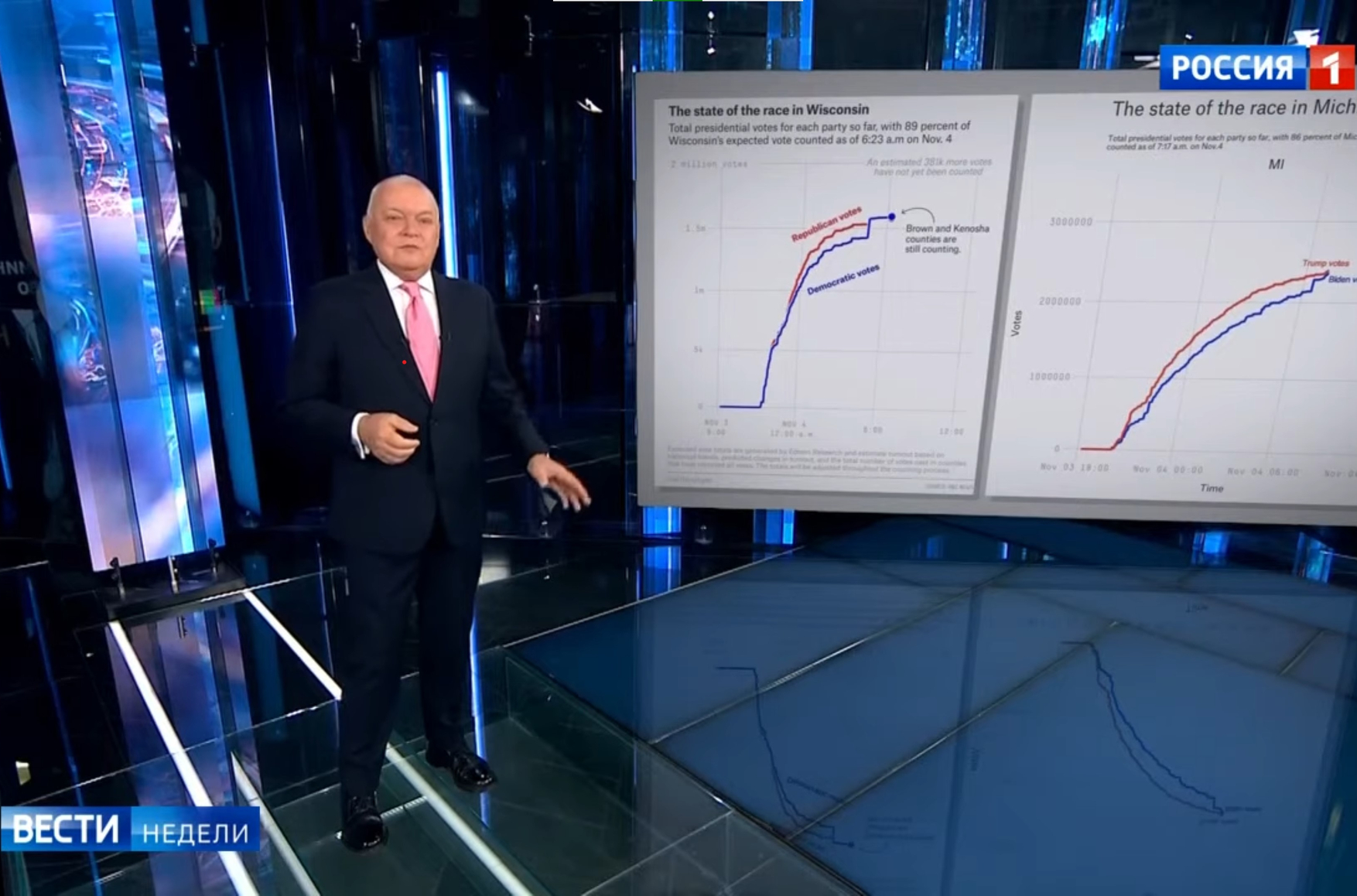 Здесь Киселев опровергает сам себя. Он рассказывает, что Трамп призвал своих избирателей не пользоваться при голосовании почтой, и тут же удивляется тому, что по почте голосовали в основном сторонники Байдена. На самом же деле все крупные американские СМИ предупреждали: такая стратегия Трампа рассчитана на то, чтобы получить на первом этапе голосования большое преимущество («красный мираж») — ведь в большинстве штатов почтовые голоса считаются в конце, — и досрочно объявить себя победителем. Обеспокоенные журналисты даже спрашивали Трампа до выборов: будет ли он дожидаться подсчета почтовых голосов, не объявит ли себя победителем досрочно — и Трамп обещал этого не делать. Журналисты обещанию не поверили — и правильно, он объявил себя победителем еще в первую же ночь голосования.