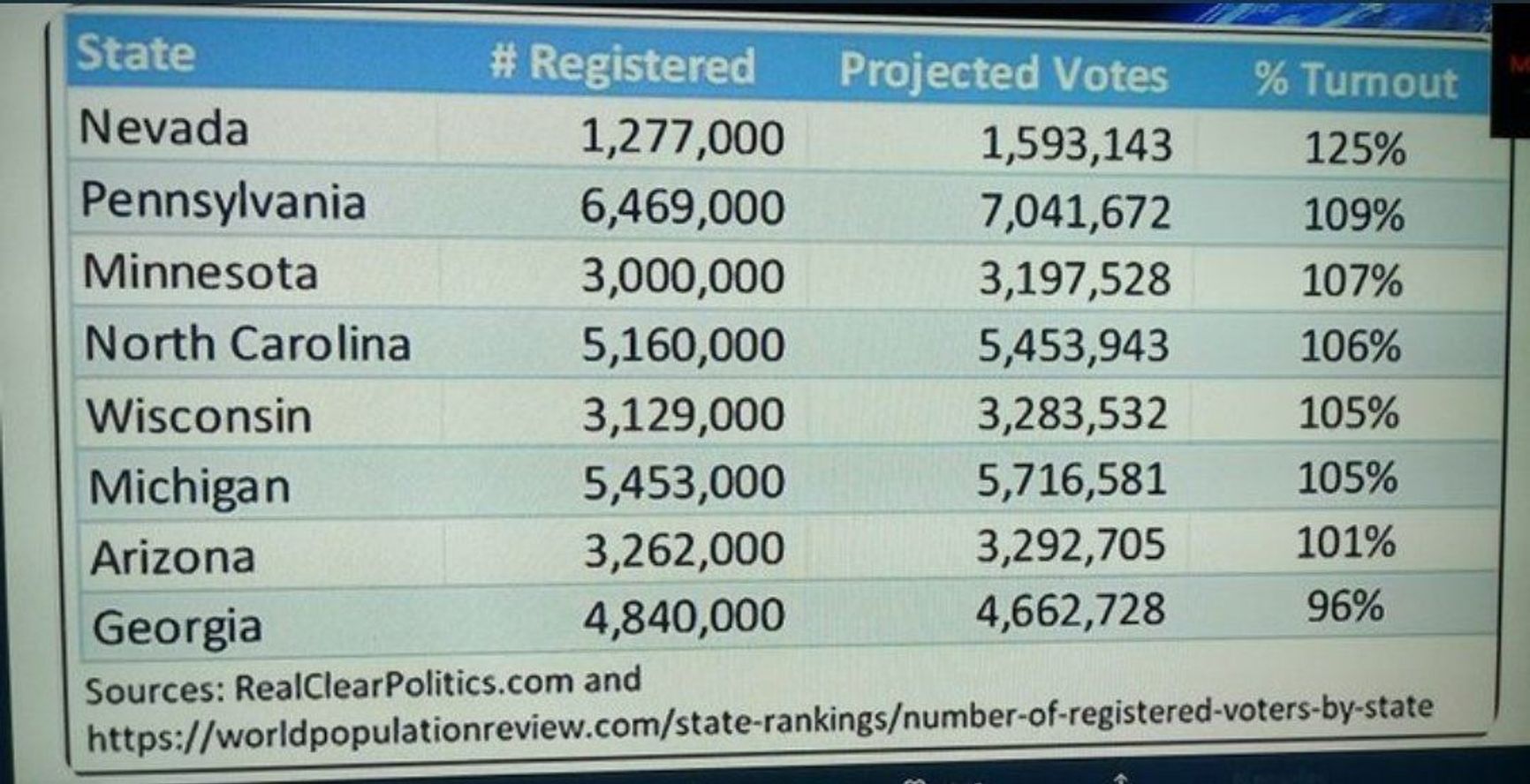 Во всех случаях для графы «число зарегистрированных избирателей» брались данные 2018 года. В США гражданин для того, чтобы получить бюллетень, должен зарегистрироваться как избиратель в каком-то штате. Поскольку выборы 2020 года привлекли огромный интерес, в период между 2018 и 2020 годом во всех штатах зарегистрировалось огромное число новых избирателей. Сколько их было на самом деле в 2020 году, можно посмотреть здесь. Если сравнить с реальными цифрами зарегистрированных, то ни в одном штате превышения 100% не было.