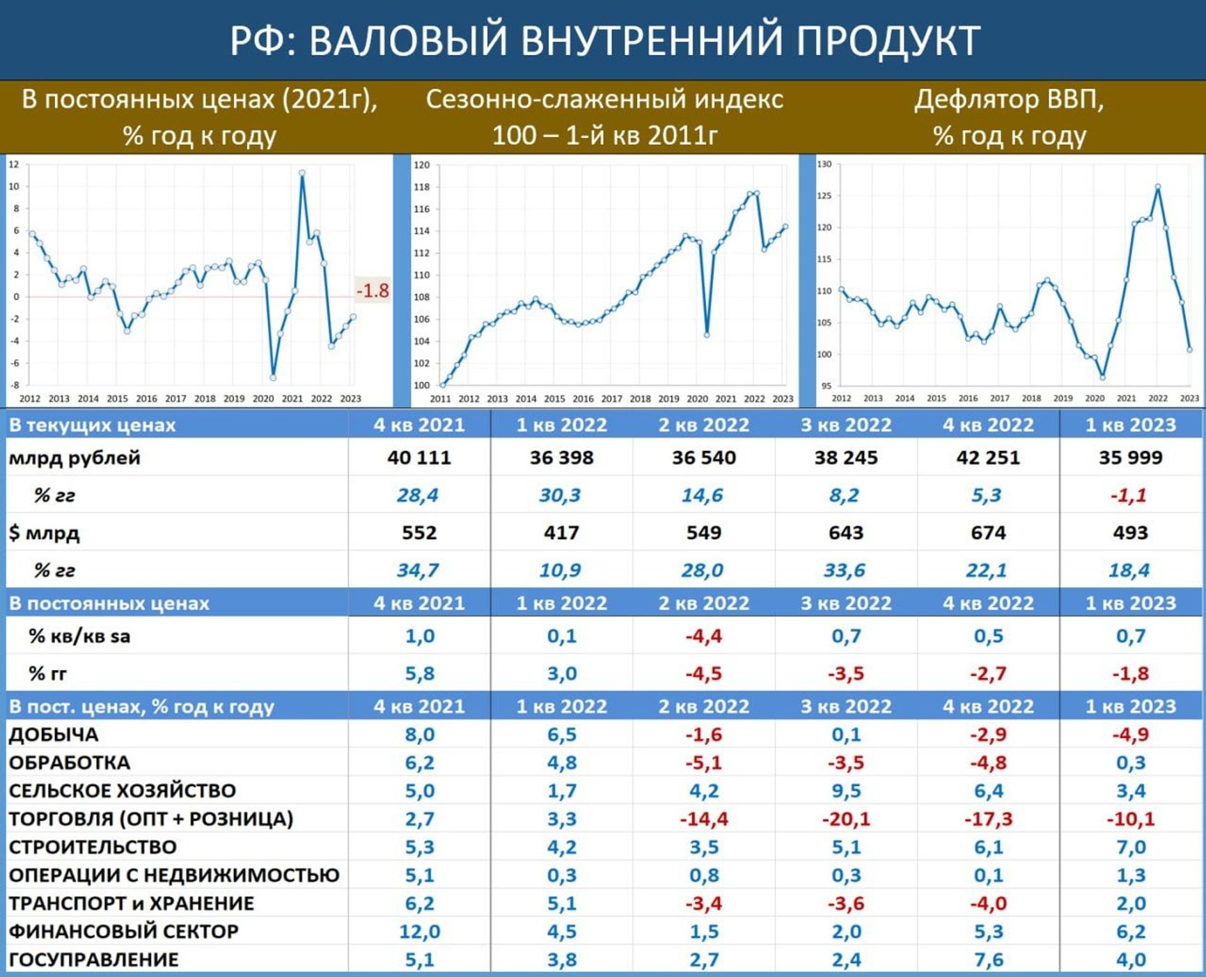 Во втором квартале 2023 года российская экономика, по данным Росстата, расширилась на 4,9% в сравнении с тем же кварталом 2022 года, на который пришелся основной шок после начала „военной спецоперации” России на Украине. В первом квартале 2023-го было снижение ВВП на 1,8% в годовом выражении».