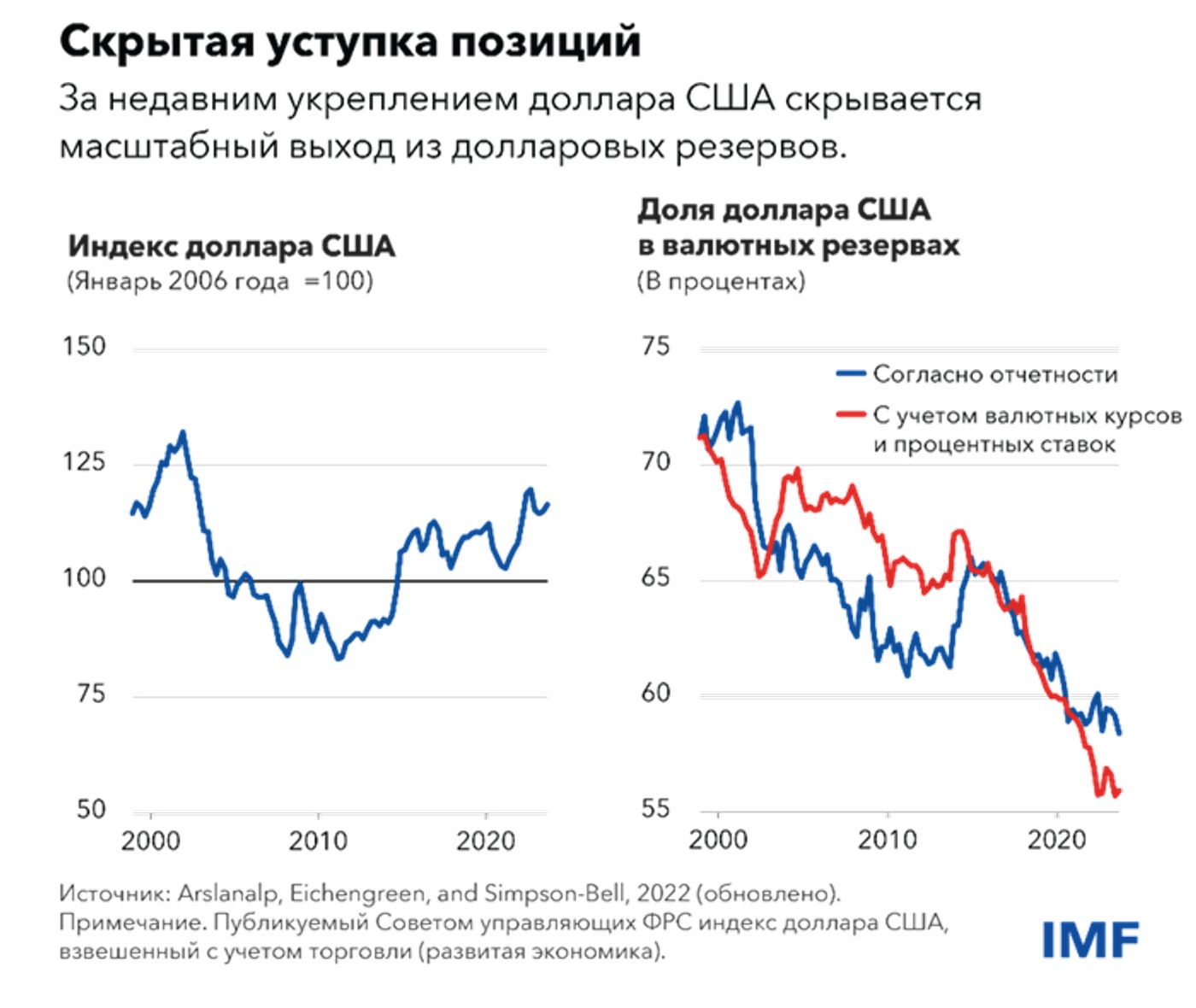 На инфографике показаны данные МВФ за 2022 год. С тех пор доля юаня в международных резервах стала сокращаться и к апрелю 2024 года упала до трехлетнего минимума.