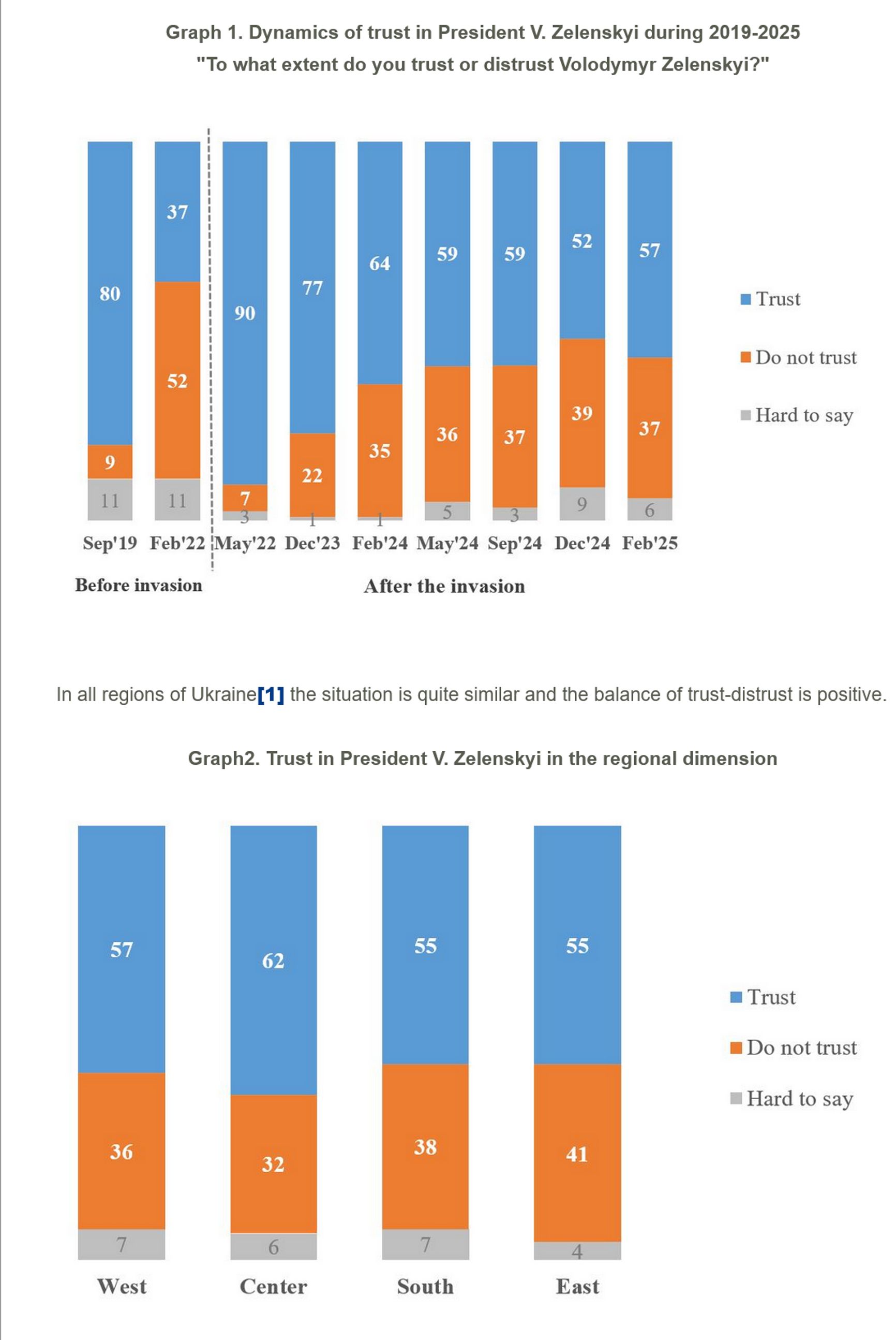 При этом рейтинг президента, в первые месяцы войны достигавший 90%, в последующее время предсказуемо снижался, но с начала 2025 года снова начал расти. Ниже 52% он не опускался никогда.