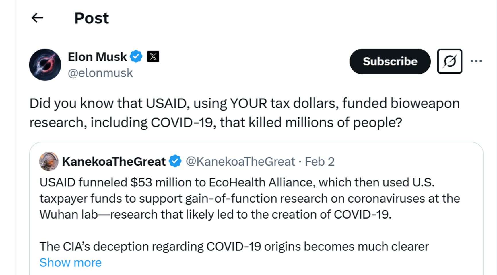 В феврале 2025 года этой темой внезапно заинтересовался Илон Маск, объявивший войну USAID. Он нашел упоминание той же программы «Предикт» в анонимном аккаунте в X, продающем курсы по заработку в этой сети, и репостнул его, снабдив комментарием: «А вы знали, что USAID на ВАШИ налоги спонсировало исследование биологического оружия, в частности, COVID-19, убившего миллионы людей?»