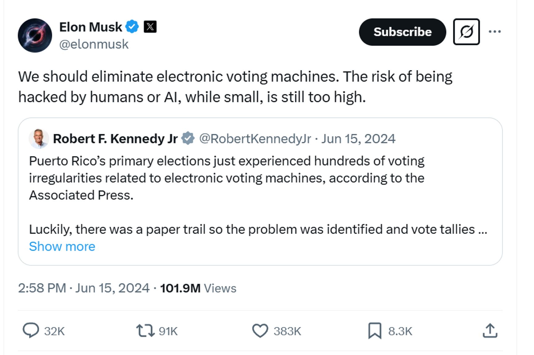 Вместе с российскими пропагандистами, начиная с середины 2024 года и до самого подсчета голосов, Маск стал активно продвигать эту старую конспирологию. Благодаря алгоритмам соцсети Х, которой Маск владеет с 2022 года, его сообщения о том, что электронное голосование не вызывает доверия, увидели сотни миллионов человек.