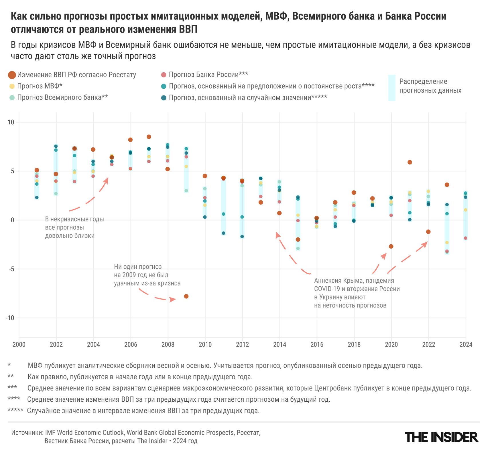 Российская экономика, несмотря на санкции, должна вырасти в этом году на 2,9%, следует из прогноза Всемирного банка, сделанного в июне. Того же ждет и Банк России. С этими радужными прогнозами есть одна проблема: их предсказательная сила не выше, чем у астрологических или гадания на картах. The Insider проанализировал результаты прогнозов по российскому и мировому ВВП, которые делались Всемирным банком, МВФ, Банком России и Минэкономразвития, и обнаружил — их оценки по точности не выше (а иногда и ниже), чем простая экстраполяция усредненного роста за последние годы. Причина проста: на экономическую ситуацию влияет слишком много переменных и вдобавок сами прогнозисты сталкиваются с некачественными данными и когнитивными искажениями.