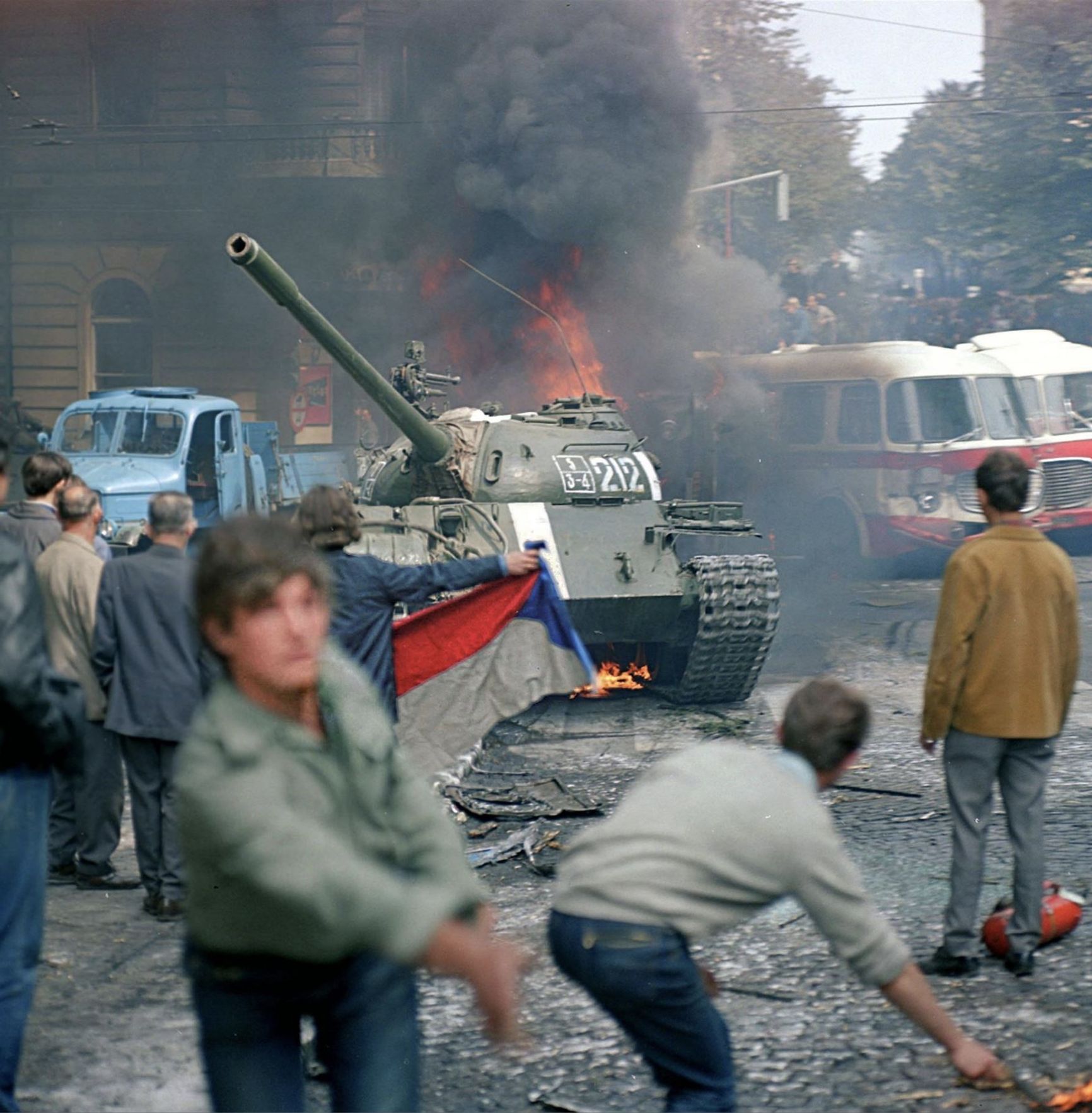 As we approached the Party Central Committee on the Vltava embankment, we saw two guys, a Czech and a Russian soldier, trying to negotiate something - apparently not with much success. The Czech was holding a bloody Czechoslovak flag, which, as it turned out, had covered the corpse of one of the first victims of the occupation early in the morning. The guy stepped back, and I spoke to the Soviet soldier. I still remember what he said to me: “My name is Seryozha, I'm from near Voronezh. In early summer I finished my two-year term of service in the GDR and was immediately recruited there for another two years to take part in some emergency exercises. I spent over a month on the Czechoslovakian border in this red-hot, dusty tin,” he pointed at an armored personnel carrier standing nearby. “You think I want this?” He was a perfectly normal Soviet young man, but I must say that I never met another one like him in occupied Czechoslovakia.