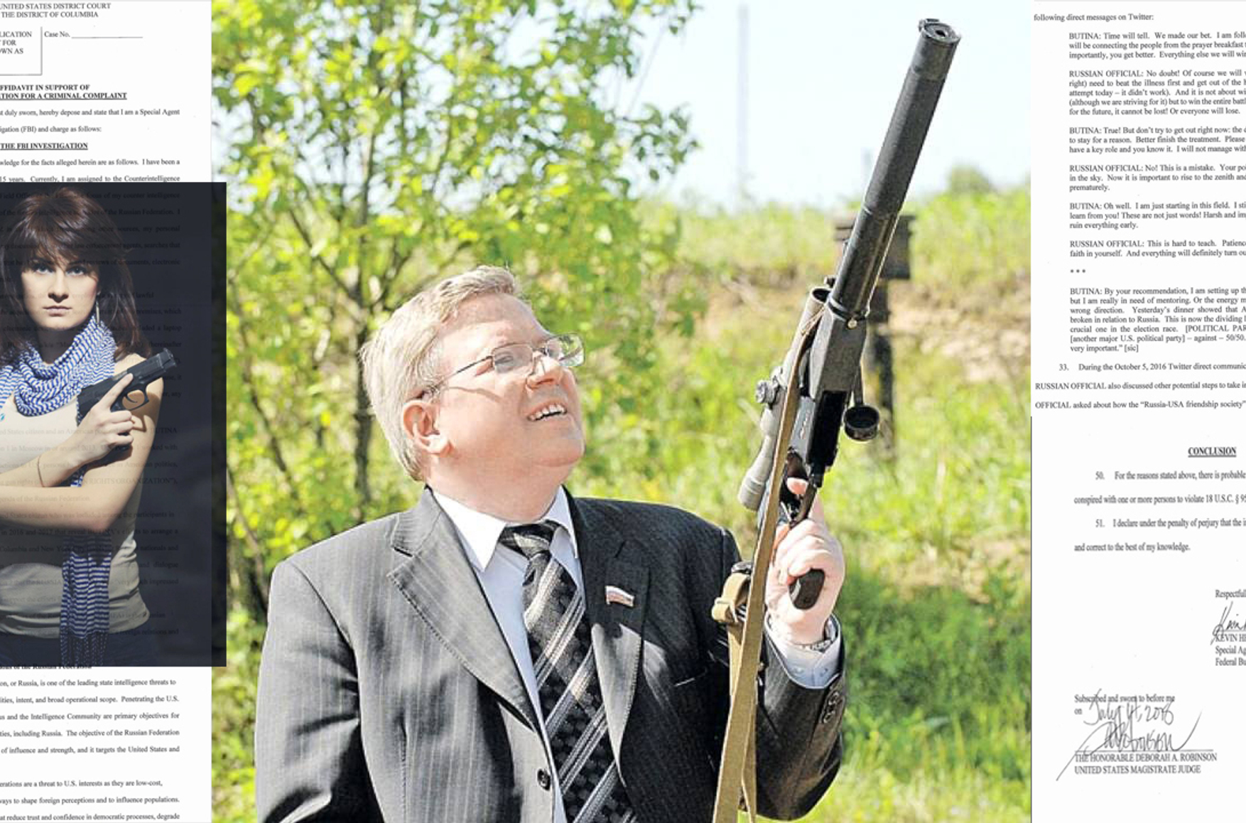 The primary source of information about Torshin's attempts to put the Kremlin in touch with the Republicans is the data obtained from surveillance of Butina. FBI special agent Kevin Helson wrote in a supporting affidavit to the criminal complaint against Butina, which was released at the website of the U. S. Department of Justice, that his testimony was based on the searches of two premises, surveillance, and examination of documents, including electronic items that had been obtained from Butina's laptop and phone. In 2014, Butina invited Paul Erickson, an NRA and Republican Party official, to give a presentation in Moscow. Soon 56-year-old Erickson started a relationship with Butina, who was 29, and introduced her to many other high-profile Republicans and NRA members. However, as the FBI points out, this relationship was more of a business necessity for Butina. For instance, she tried to bed another official, whose name is not revealed, in return for a post in an organization (presumably, the NRA). The FBI also states that she bemoaned having to live with Erickson in one of the letters and spoke of him with disdain.