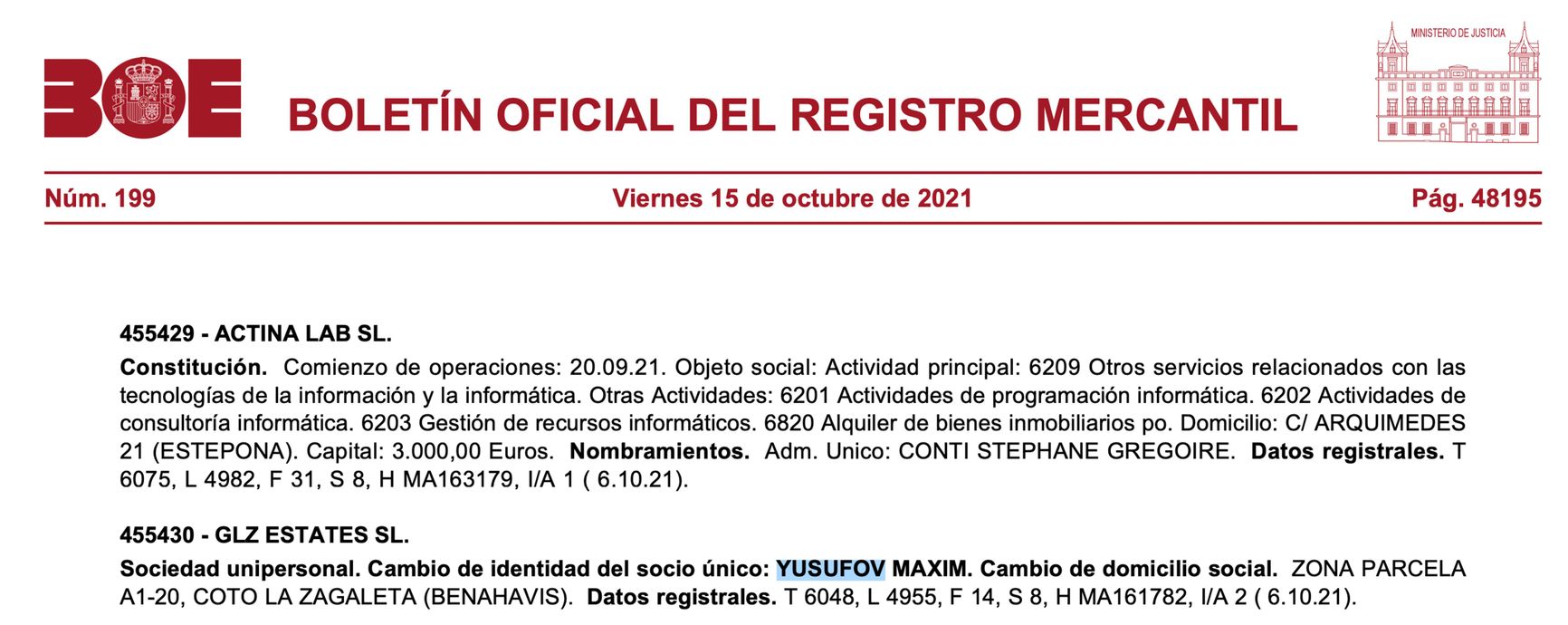 Maxim Yusufov’s name can be found in the Spanish business register. He heads the real estate management firm GLZ ESTATES SL. in Benahavis, Malaga province.