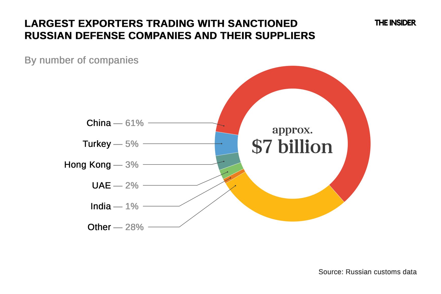 The majority of exporting companies are based in China (around 4000, including entities based in Hong Kong), Turkey (around 300), the UAE (around 120), and India (60). Together, they account for two-thirds of trade with sanctioned companies and defense-industry clients.