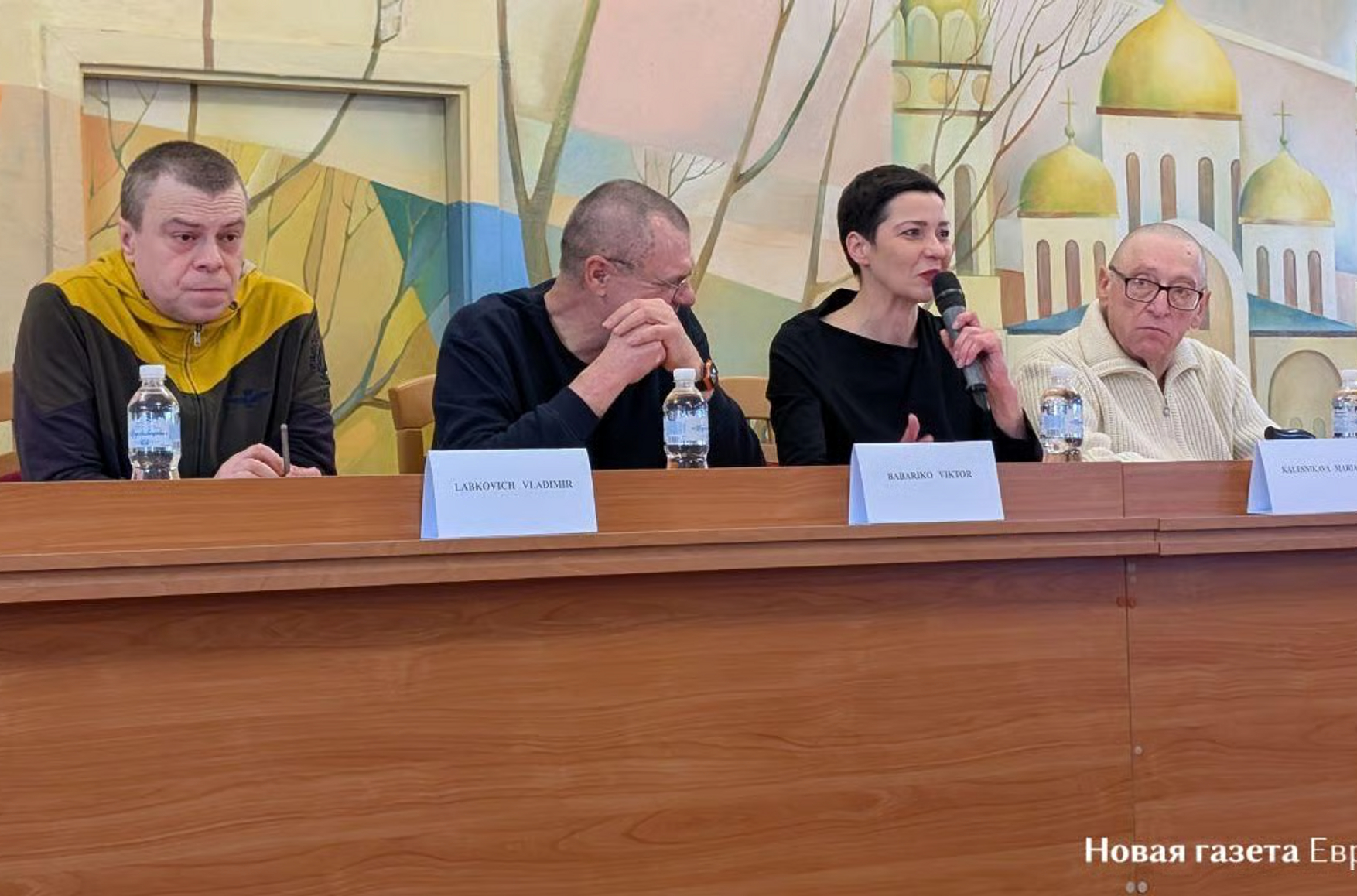 Former political prisoners Viktar Babaryka, Maria Kalesnikava, Uladzimir Labkovich and Aleksandr Feduta speak at a press conference in Chernihiv. Photo: Novaya Gazeta Europe