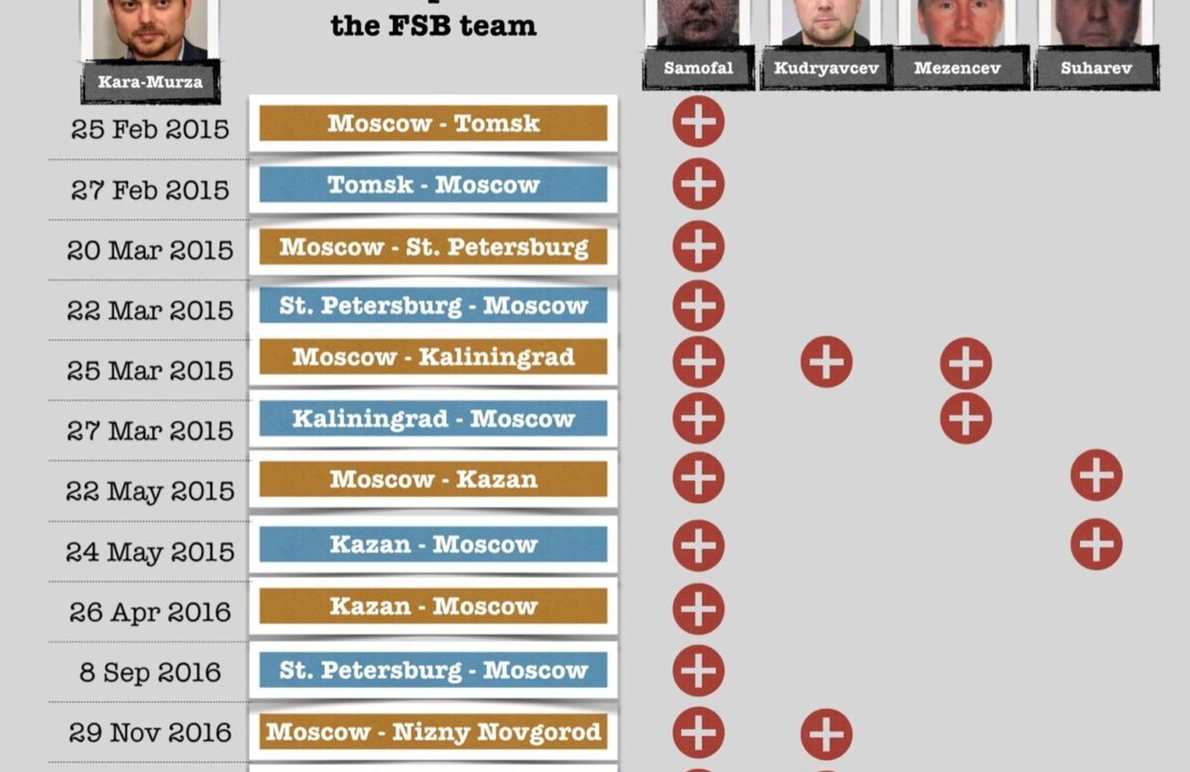In December 2015, as soon as doctors cleared Kara-Murza to fly, he returned to Moscow. In April 2016, he made two work trips to the regions: the first one to Irkutsk (April 13-16) and the second one to Tatarstan (April 24 to Naberezhnye Chelny, April 25-26 to Kazan). At that time the poisoners started to pursue him again. Alexander Samofal flew to Kazan from Yekaterinburg, and Sukharev flew to Kazan from Moscow - both on April 25, shortly before Kara-Murza arrived there. They returned to Moscow on April 26, a few hours before Kara-Murza's departure.