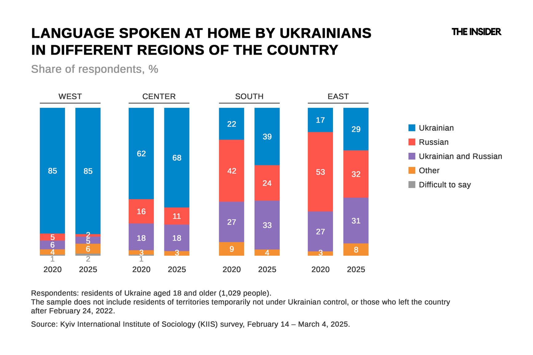 Five years ago, 42% of residents in southern Ukraine communicated at home only in Russian, but by 2025, this figure had fallen to just 24%. In the east, the same measure fell from 53% to 32%. According to Fesenko, the process of national self-identification in these regions has intensified. Many have switched to Ukrainian for political reasons.