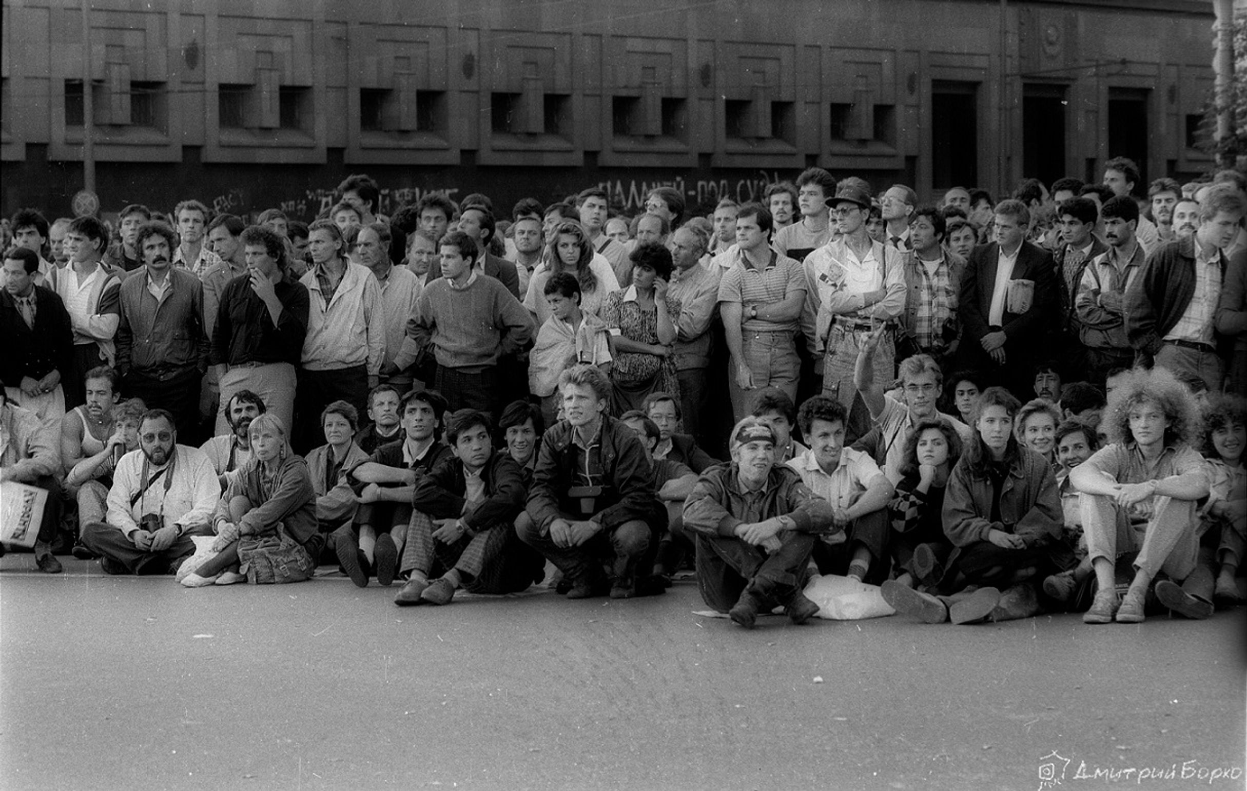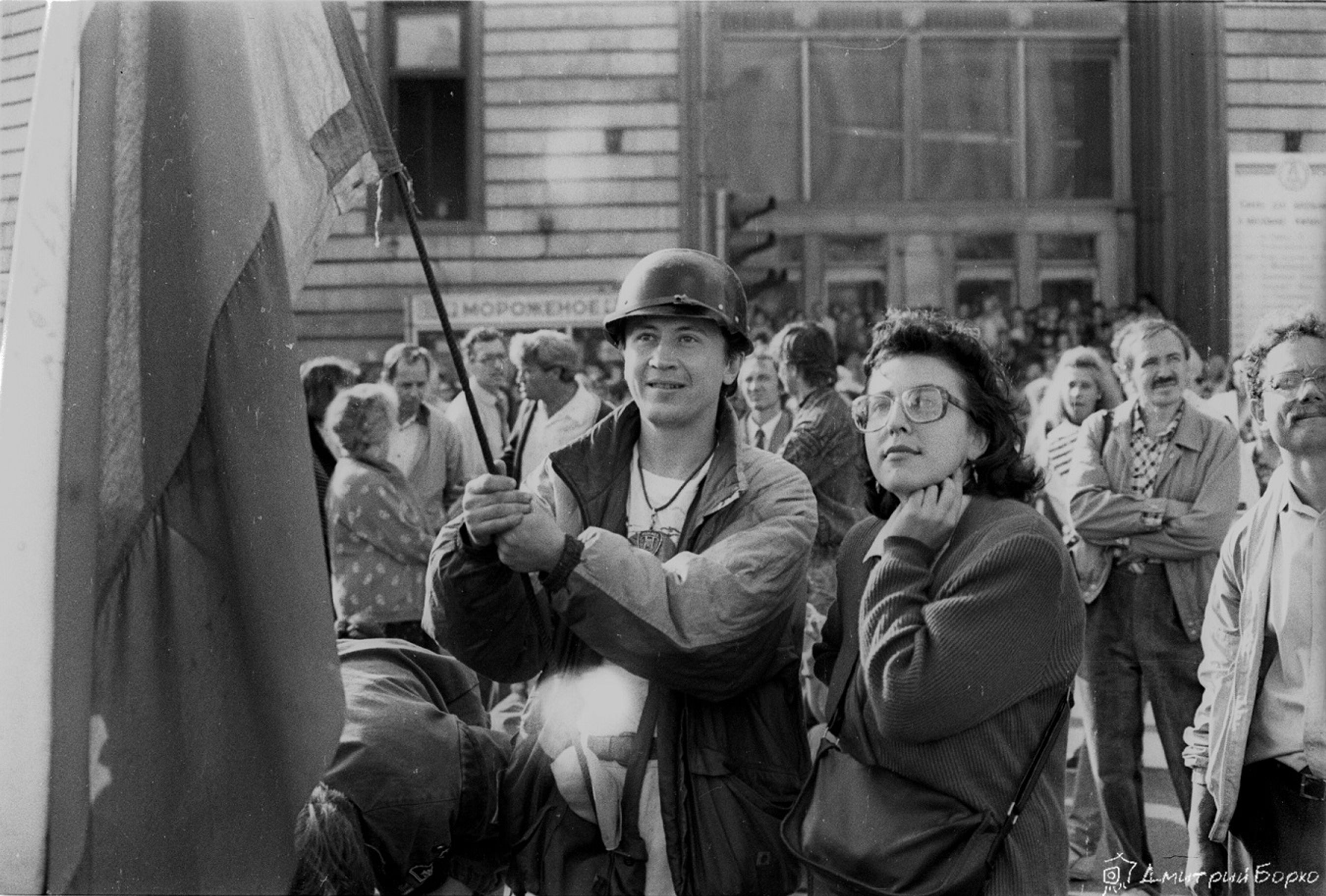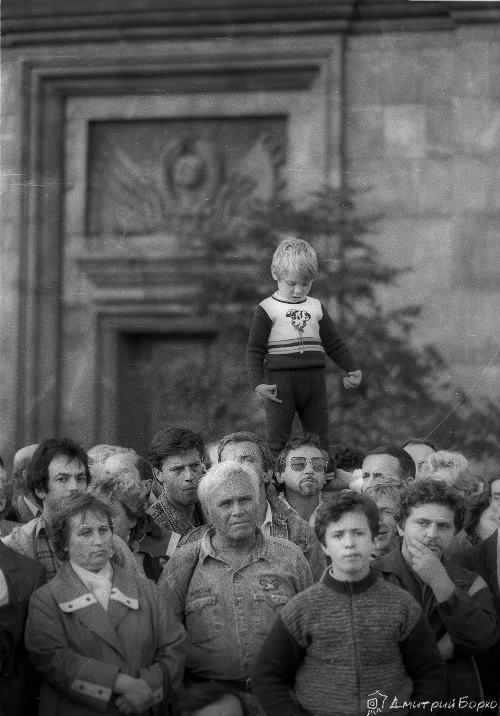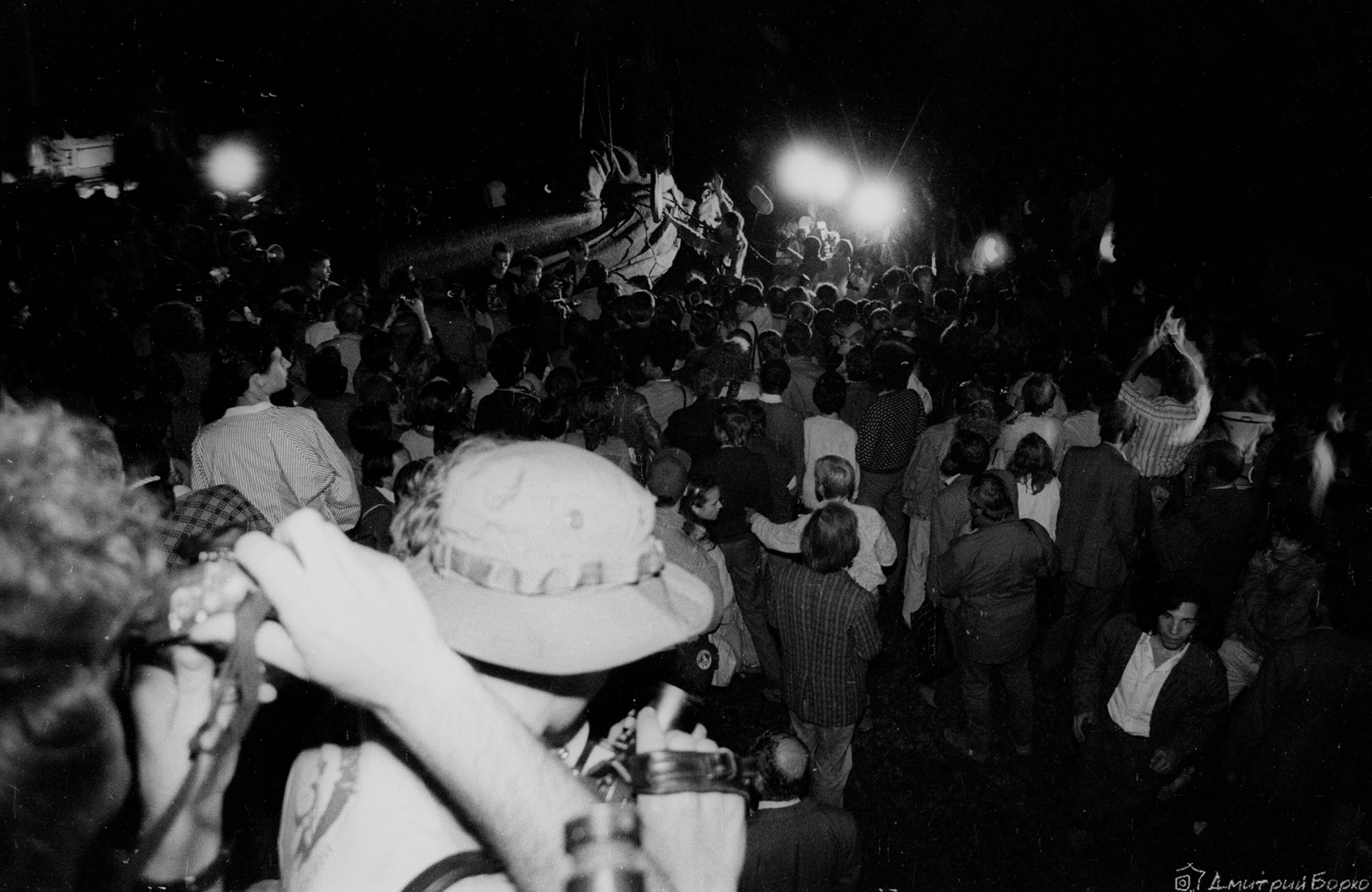 Пока ждали сноса на Лубянке (пл. Дзержинского еще тогда), впервые познакомился с Кронидом Любарским (он приехал в Москву впервые и стоял со всеми в толпе). Принесли «Независимую», где я работал — напечатали первый после запрета номер, все расхватывали и читали, окружив кучей. Кто-то что-то пел под гитару. К ночи, когда Феликса удается наконец снять с пьедестала, я с облегчением собираюсь домой, но замечаю в толпе Ростроповича. Он умудряется одновременно пожимать тянущиеся к нему руки и разливать шампанское в пластиковые стаканчики. Но они кончаются, и мне суют бутылку так — давай из горла! У моей вспышки сели батарейки, пленки осталось — пара кадров, и я долго выжидал момент, чтобы нажать только один раз — наверняка