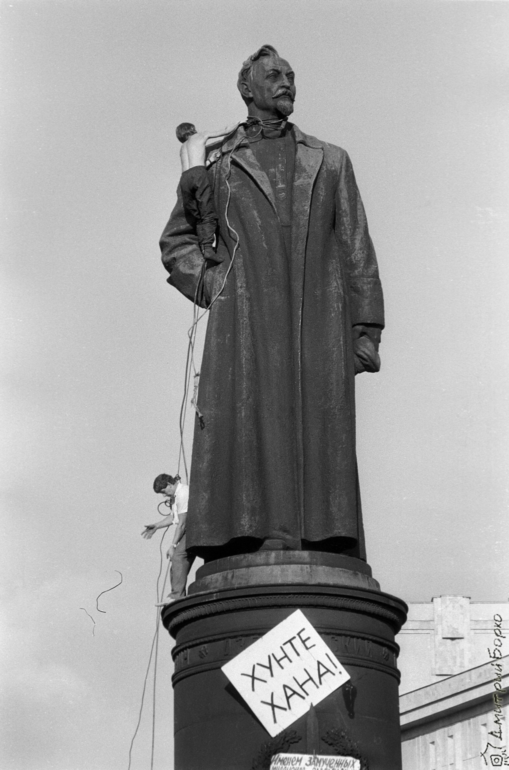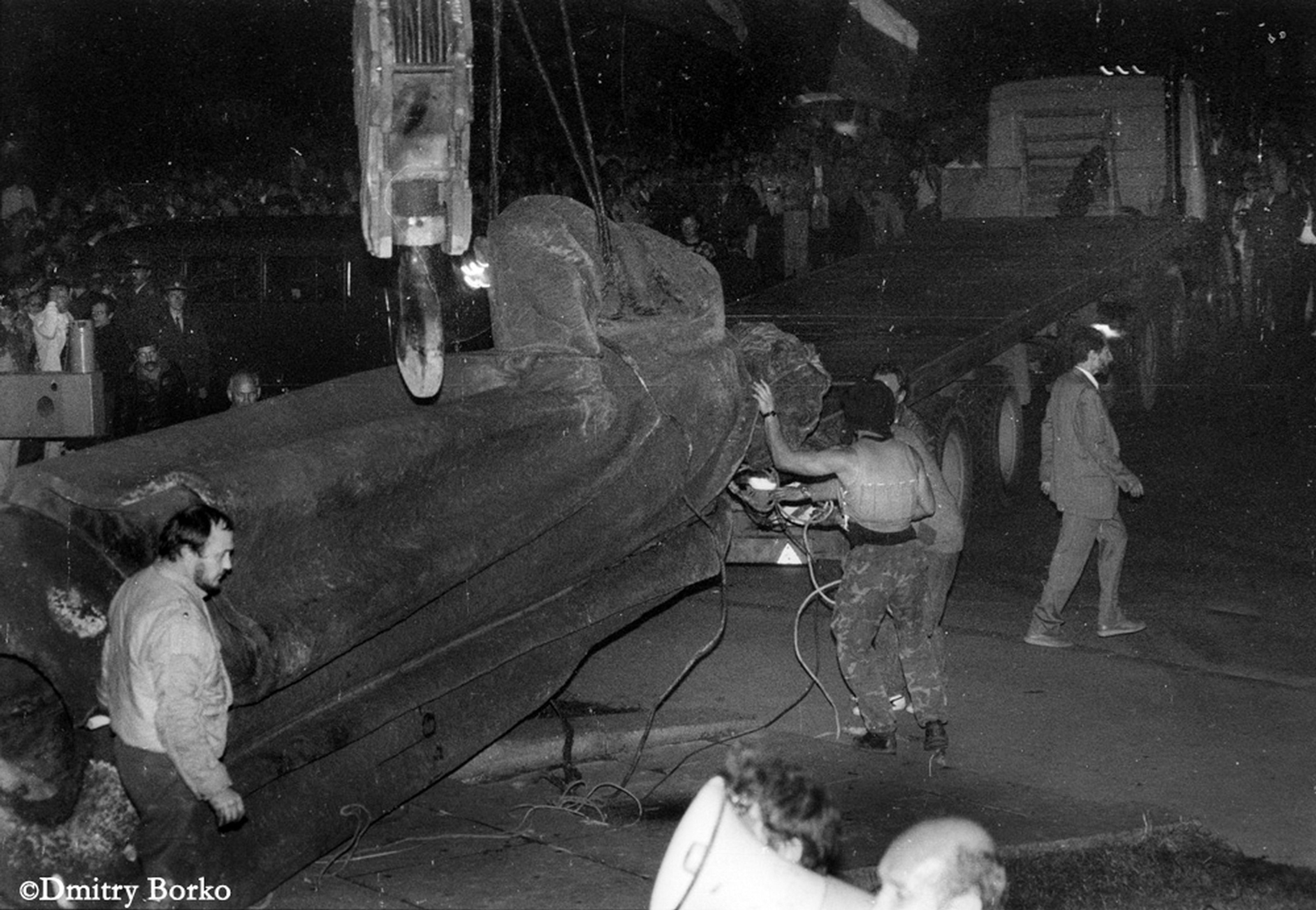 Вот профессионалы все сделали правильно, погрузили мы его на платформу, увезли на Крымскую набережную. В последний момент, когда полметра оставалось до платформы, произошел последний прорыв людей, и где-то с полчаса было полное безумие вокруг этой статуи… С плясками, лозунгами, обниманиями. А статуя эта висела, что было лично для меня очень драматическим моментом. Я ведь отвечал за все, что происходит, не дай бог, случись что, если бы кто-то покалечился, ответственность была бы на мне. Кроме того, нужно было всему этому придать законную форму, поэтому я прямо с площади обзванивал членов Совета президиума, чтобы набрать необходимое большинство для принятия решения по демонтажу памятнику. По телефону-то мы собрали достаточное число голосов членов президиума, но оформить все письменно мы смогли только на следующий день, хотя я был уверен, что большинство — «за» это решение.