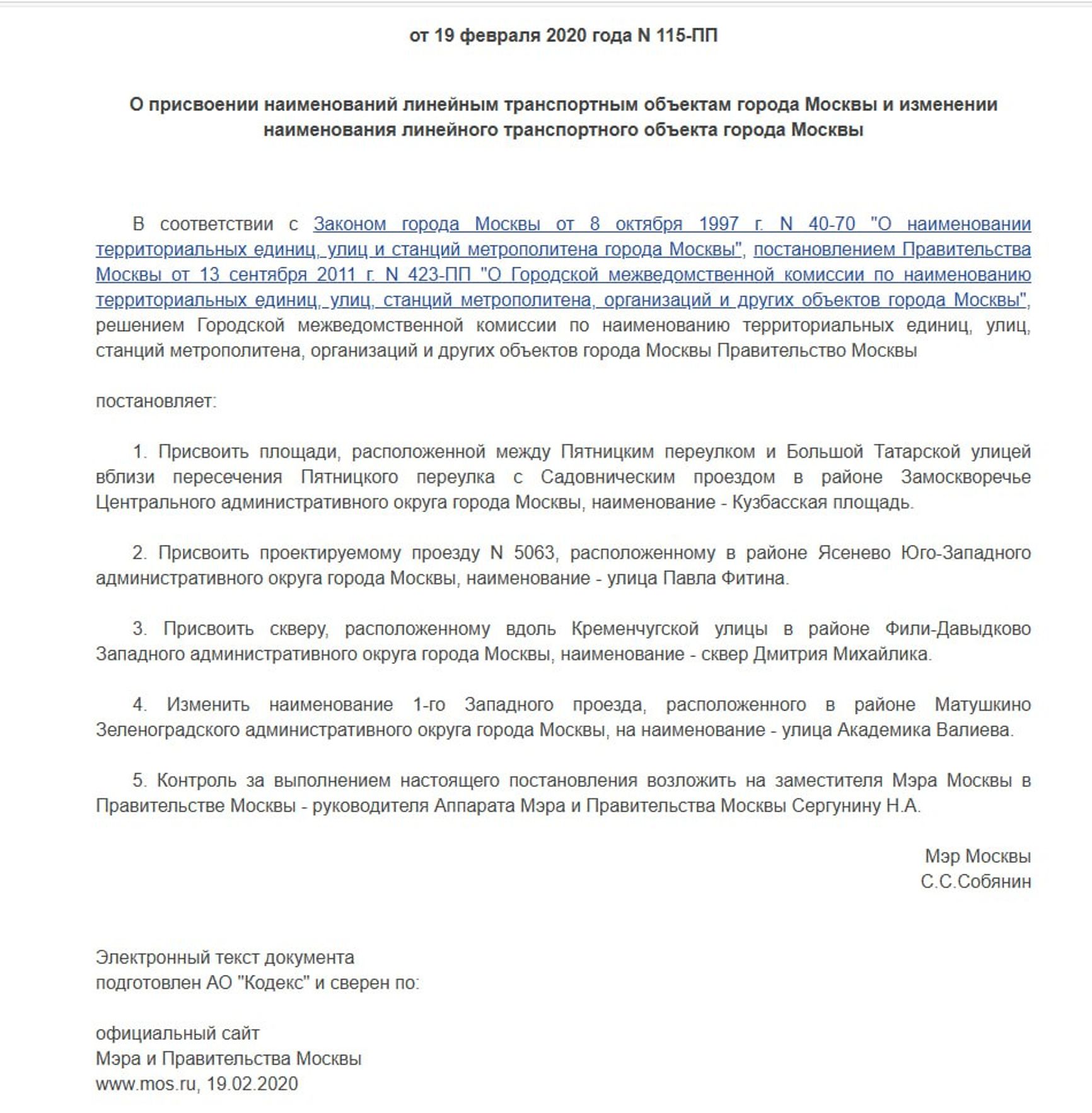 По информации источника The Insider в столичной мэрии, Нарышкин предложил Сергею Собянину присвоить имена советских шпионов еще как минимум двенадцати площадям и улицам. В ближайшие пять лет планируется увековечить имена Юрия Шевченко, работавшего в Испании и Португалии под видом сотрудника ЮНЕСКО, руководителя резидентуры КГБ в Тунисе Вадима Кирпиченко, бывшего главы СВР Вячеслава Трубникова, которого называли «рыцарем холодной войны», Евгения Кима, шпионившего в странах Азии, и бывшего резидента КГБ в Иране Владимира Лохова. Переименования в основном коснутся «недружественных» улиц. Например, в центре Москвы под нож могут попасть так раздражающие патриотов Рижская площадь и вокзал, на севере — Таллинская улица, а в Ясенево — Вильнюсская улица и Литовский бульвар.