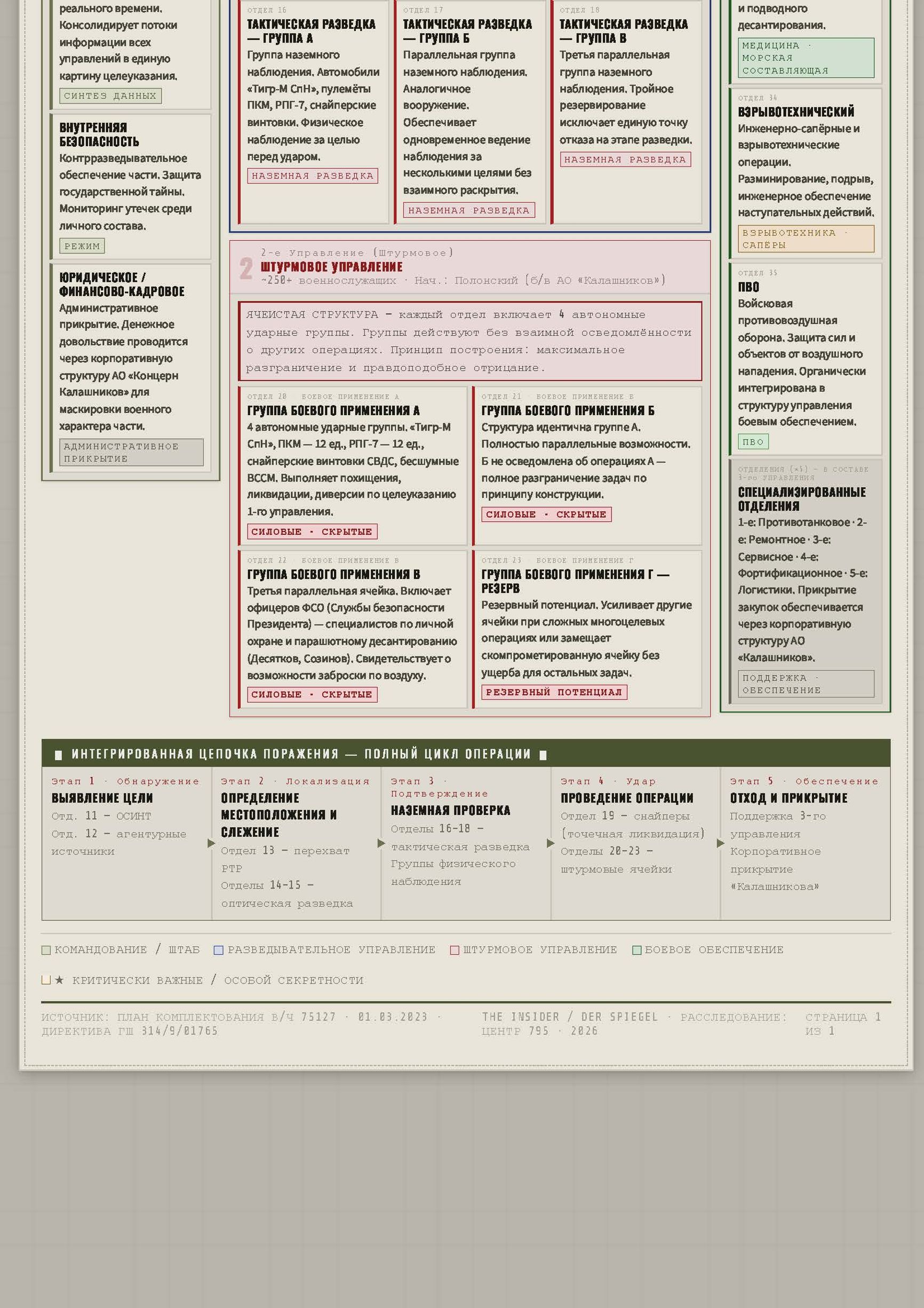 Штурмовое управление включает четыре отдела боевого применения, каждый из которых содержит четыре автономные ударные группы. Архитектура построена на едином принципе: ни одна группа не осведомлена о действиях остальных. Скомпрометированная ячейка не способна раскрыть параллельную операцию. Присутствие десантников из ФСО (бывают и такие) и ГРУ в третьем управлении свидетельствует о том, что у подразделения есть возможности для заброски по воздуху, выходящие за рамки всего, чем когда-либо располагала в/ч 29155.