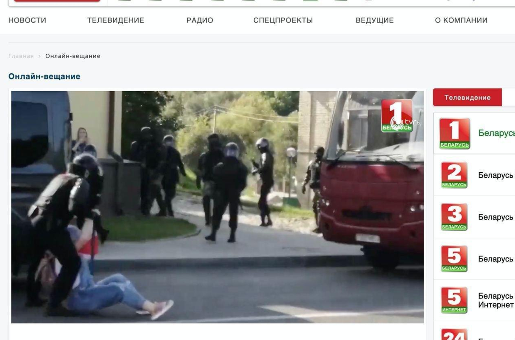 Онлайн-трансляция вечерних новостей на «Беларусь 1» и ОНТ прервалась сценами жесткого избиения мирных демонстрантов.