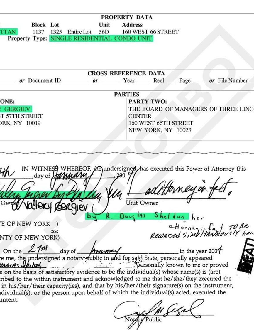 Апартаменты Гергиева находятся в 60-этажном комплексе Three Lincoln Center, в одном из самых роскошных кондоминиумов Манхэттена. В распоряжении владельцев квартир Three Lincoln находится швейцар, фитнес-центр, бассейн и конференц-центр на верхних этажах.