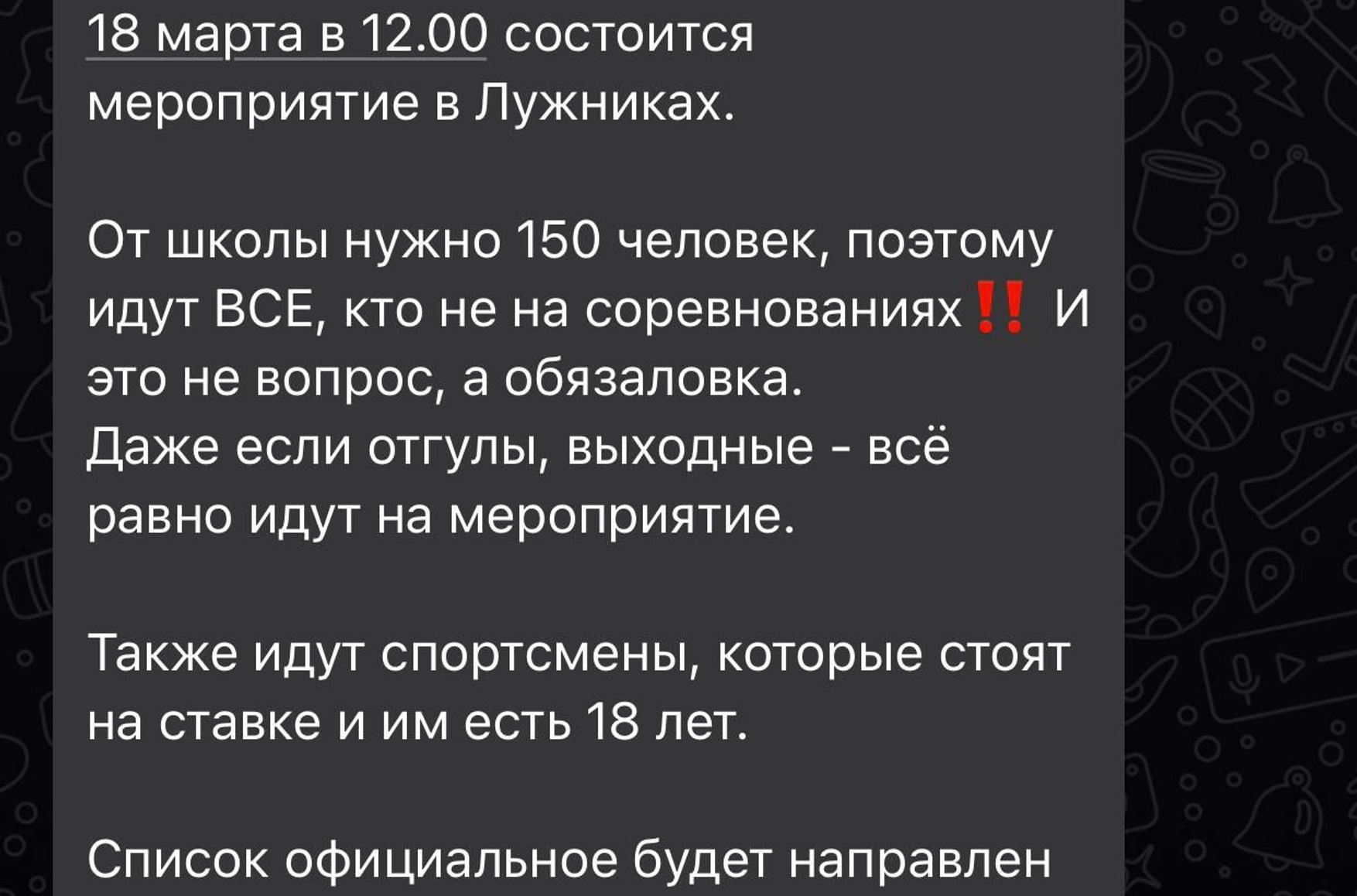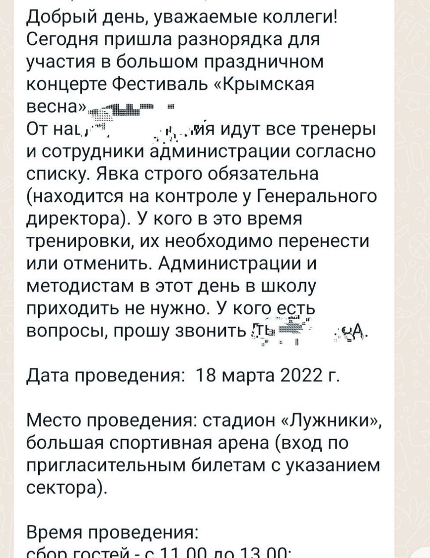 18 марта в России пройдут патриотические акции по случаю годовщины аннексии Крыма и в поддержку войны в Украине. Центральным событием станет концерт в Лужниках с участием эстрадных артистов. Об этом сообщает Telegram-канал «Можем объяснить», который публикует скриншоты сообщений от руководства государственных предприятий, школ и других бюджетных учреждений, присланные читателями канала.