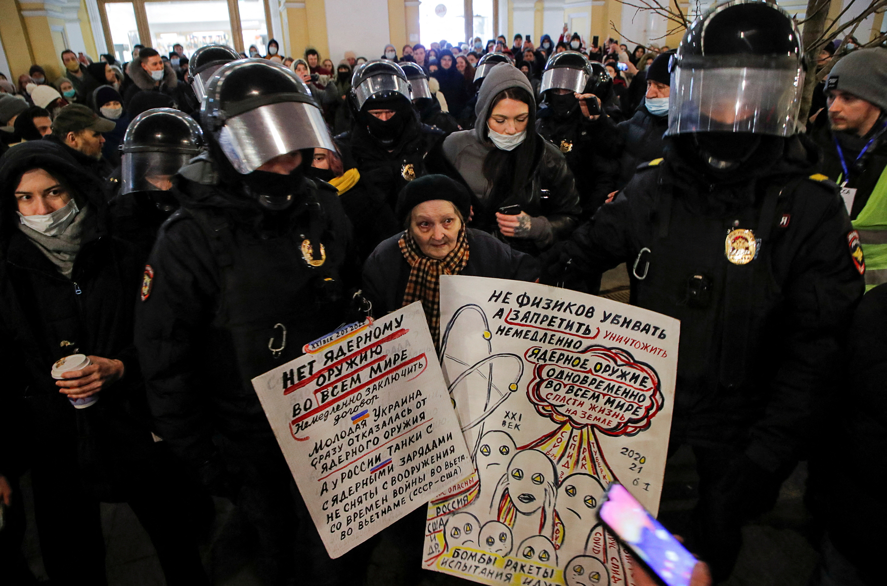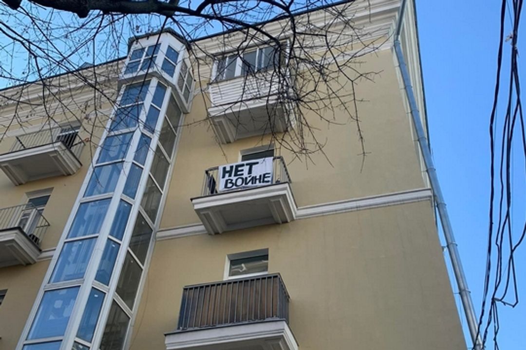 25 февраля полицейские задержали 18-летнюю москвичку Нину Крюкову, которая вывесила на балкон своей квартиры плакат «Нет войне», сообщила сестра задержанной, журналистка Марфа Смирнова. Ночью его снимали сотрудники коммунальных служб, подогнавшие к дому кран с люлькой. Утром Крюкова повесила новый плакат, после чего к ней пришли полицейские. Они отвезли москвичку в ОВД и составили протокол об участии в несанкционированной акции (ч. 5 ст. 20.2 КоАП).