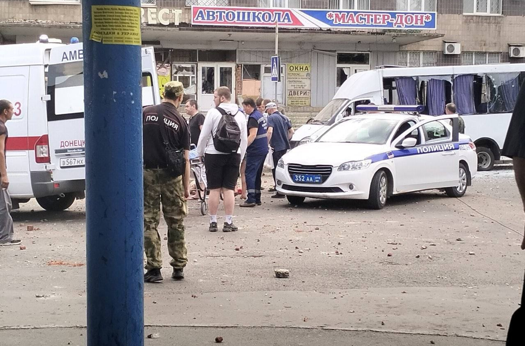 РИА «Новости» пишет, что была обстрелена автостанция. Агентство опубликовало видео с разрушениями, а также воронками от ударов. Издание утверждает, что жертвами атаки стали водитель маршрутного автобуса и еще один человек.