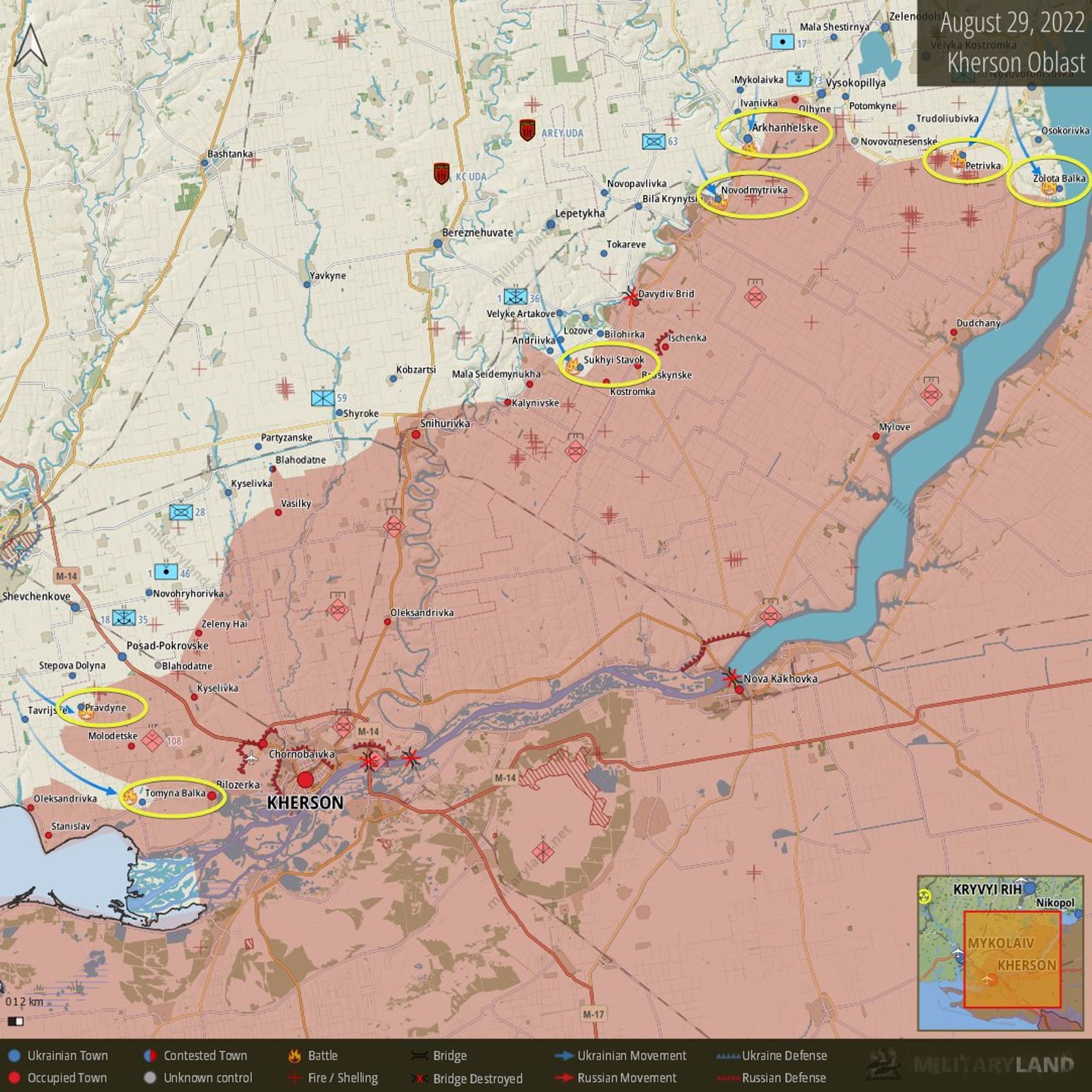 Бои у Ингулецкого плацдарма, в районе Снигиревки и прямое наступление на Херсон видны и на спутниковых снимках пожаров NASA Firms. Бывший руководитель боевиков ДНР Игорь Гиркин (Стрелков) сообщает (впрочем, не уточняя источник), что впервые ВСУ начали применять HIMARS по пехоте, тогда как ранее эта артилерия использовалась только для уничтожения объектов в тылу — складов вооружения, пунктов управления.