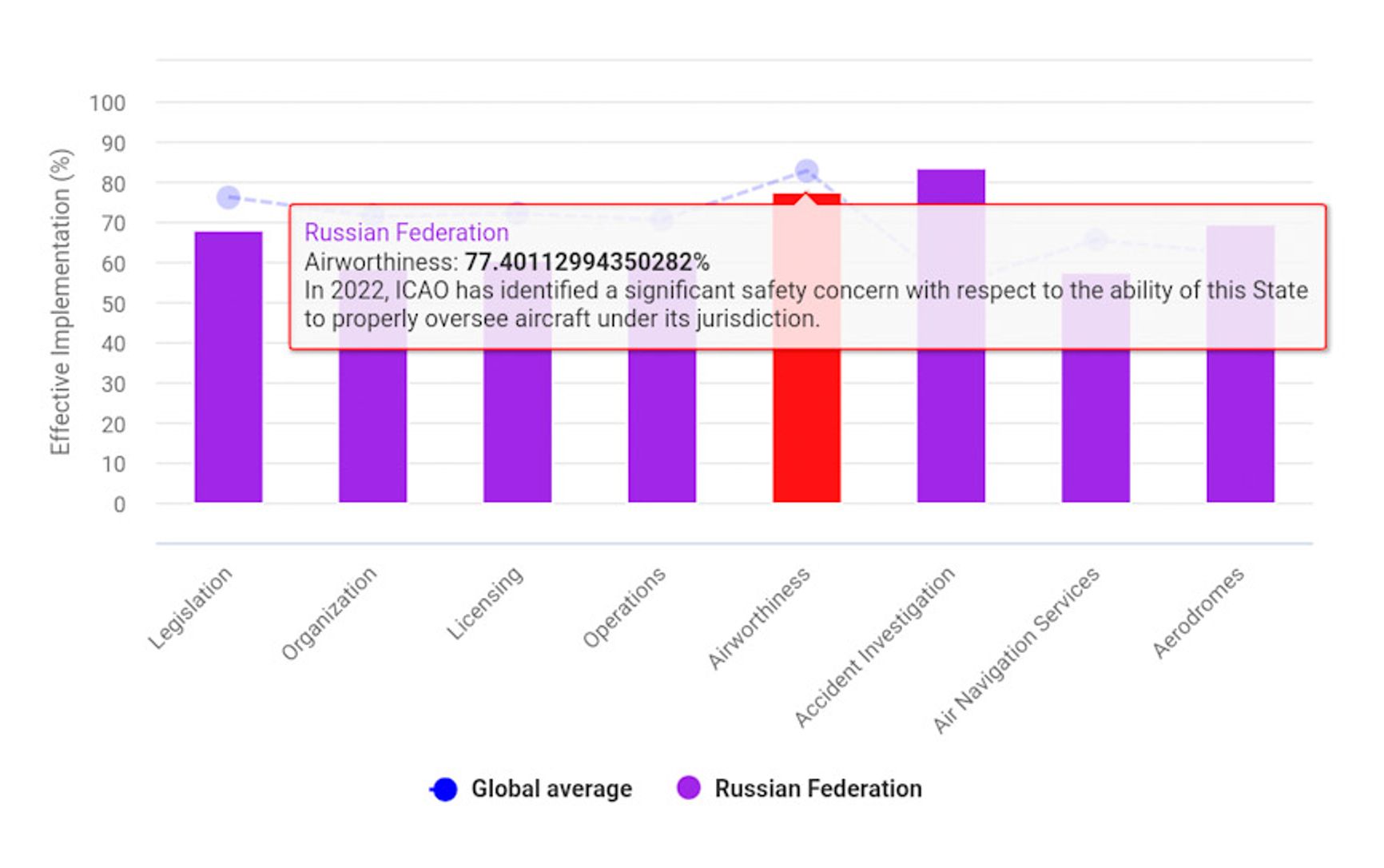Организация понизила до 77,4% свою оценку эффективности реализации стандартов в категории «летная годность» в РФ. «В 2022 году ICAO выявила серьезную проблему в области безопасности в отношении способности России должным образом контролировать воздушные суда, находящиеся под ее юрисдикцией», — говорится в пояснениях.