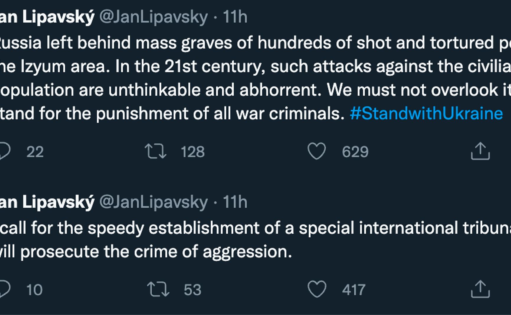 «Россия оставила после себя братские могилы сотен расстрелянных и замученных людей в Изюме. В 21 веке такие нападения на мирное население немыслимы и отвратительны. Мы не должны упускать это из виду. Мы выступаем за наказание всех военных преступников. Я призываю к скорейшему созданию специального международного трибунала, который расследует преступление агрессии», — написал он.