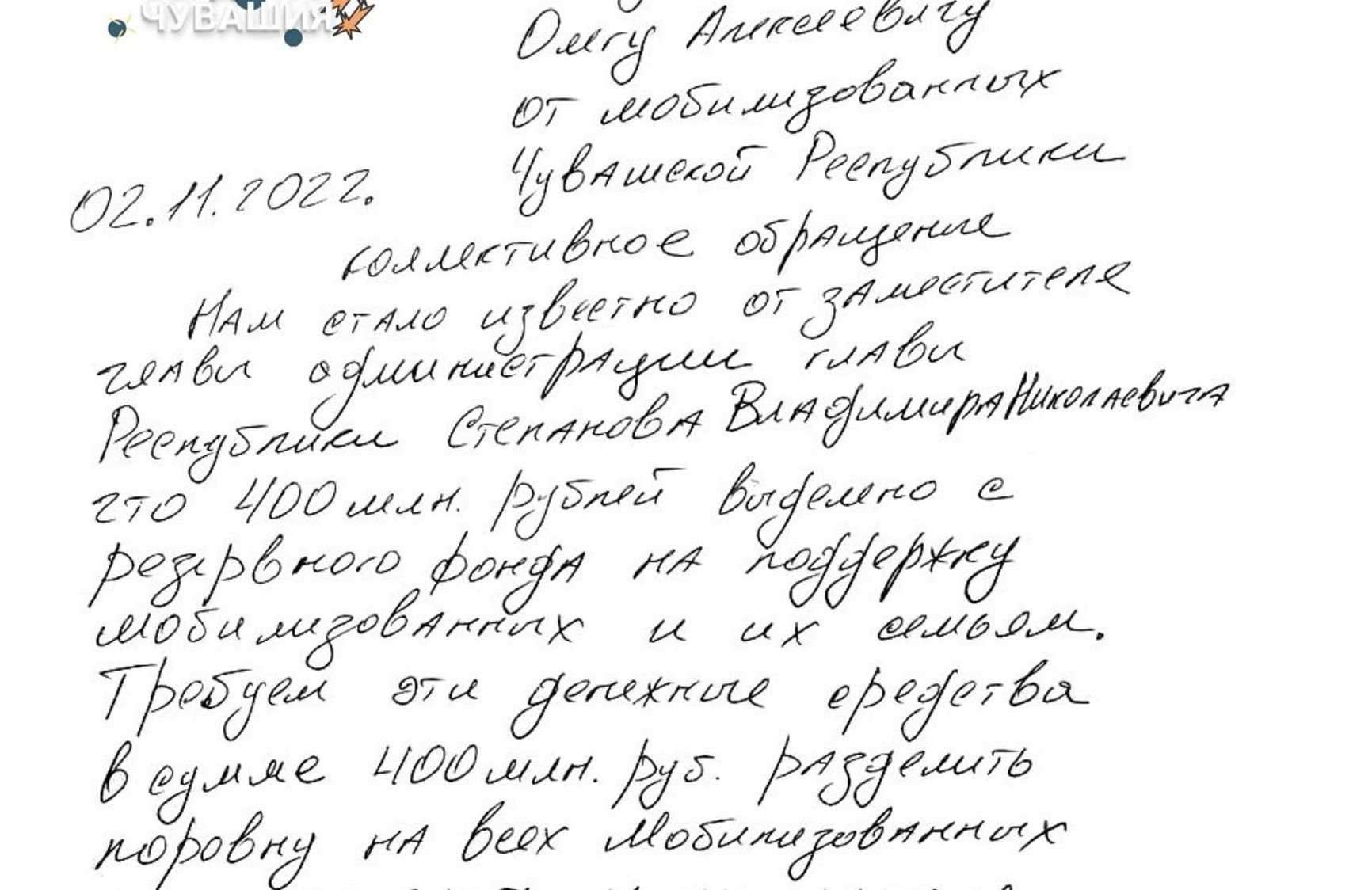 «Уважаемые граждане Российской Федерации, обращаются к вам мобилизованные военнослужащие Чувашской Республики! Мы, рискуя собственной жизнью, идем на верную смерть для вашей безопасности и мирной жизни! Наше государство отказывается выплатить нам денежные средства в размере 195 тысяч рублей, которые нам обещал наш президент Владимир Владимирович Путин! Ради чего тогда нам идти воевать за это государство, оставив свои семьи без поддержки?»