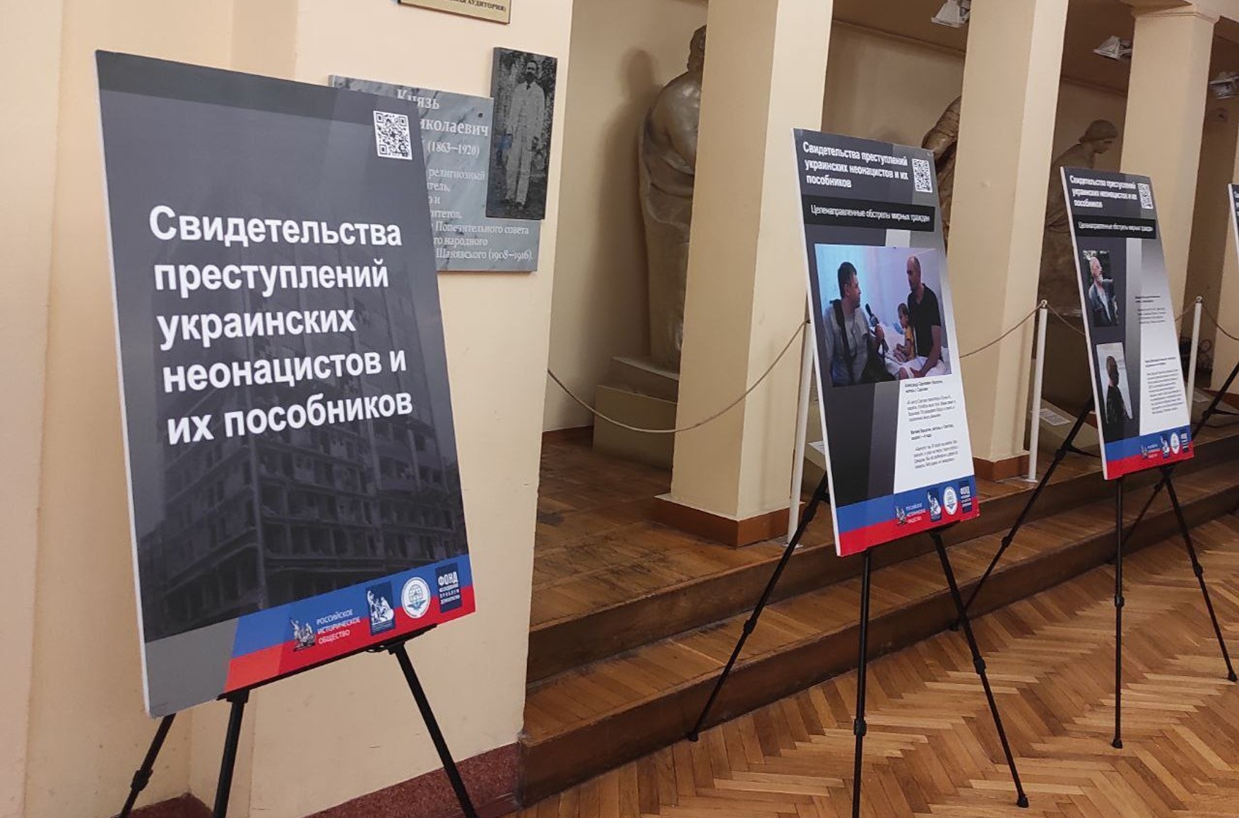 В Российском государственном гуманитарном университете в холле организовали пропагандистскую выставку, которая рассказывает о якобы преступлениях украинских неонацистов и их пособников на войне. Об этом пишет SOTA со ссылкой на подписчиков.