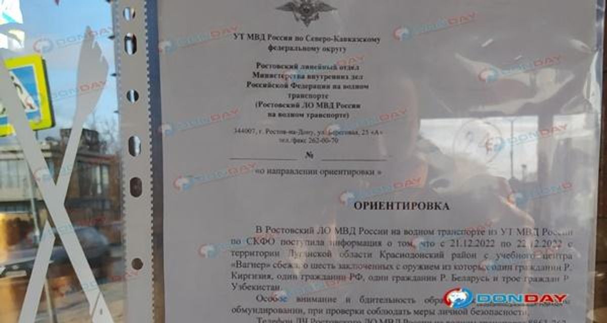 В Ростове-на-Дону разыскивают шестерых вооруженных заключенных, сбежавших из учебного центра ЧВК Вагнера в Краснодонском районе Луганской области 21-22 декабря. Об этом сообщает местный портал DonDay со ссылкой на развешенные по городу ориентировки, одно из объявлений было замечено в кафе на Береговой улице.