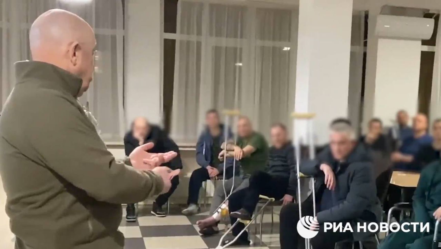 В конце видео Пригожин призывает бывших заключенных, часть из которых, сидят перед ним с костылями, «много не бухать», «наркотики не употреблять», «баб не насиловать» и «не бедокурить».