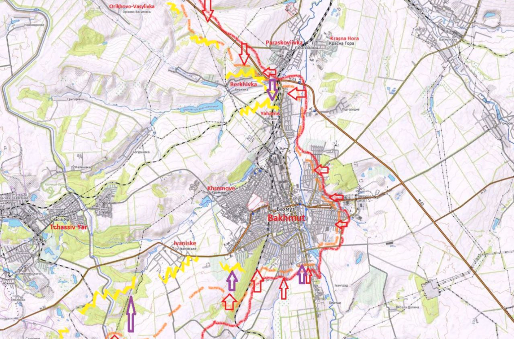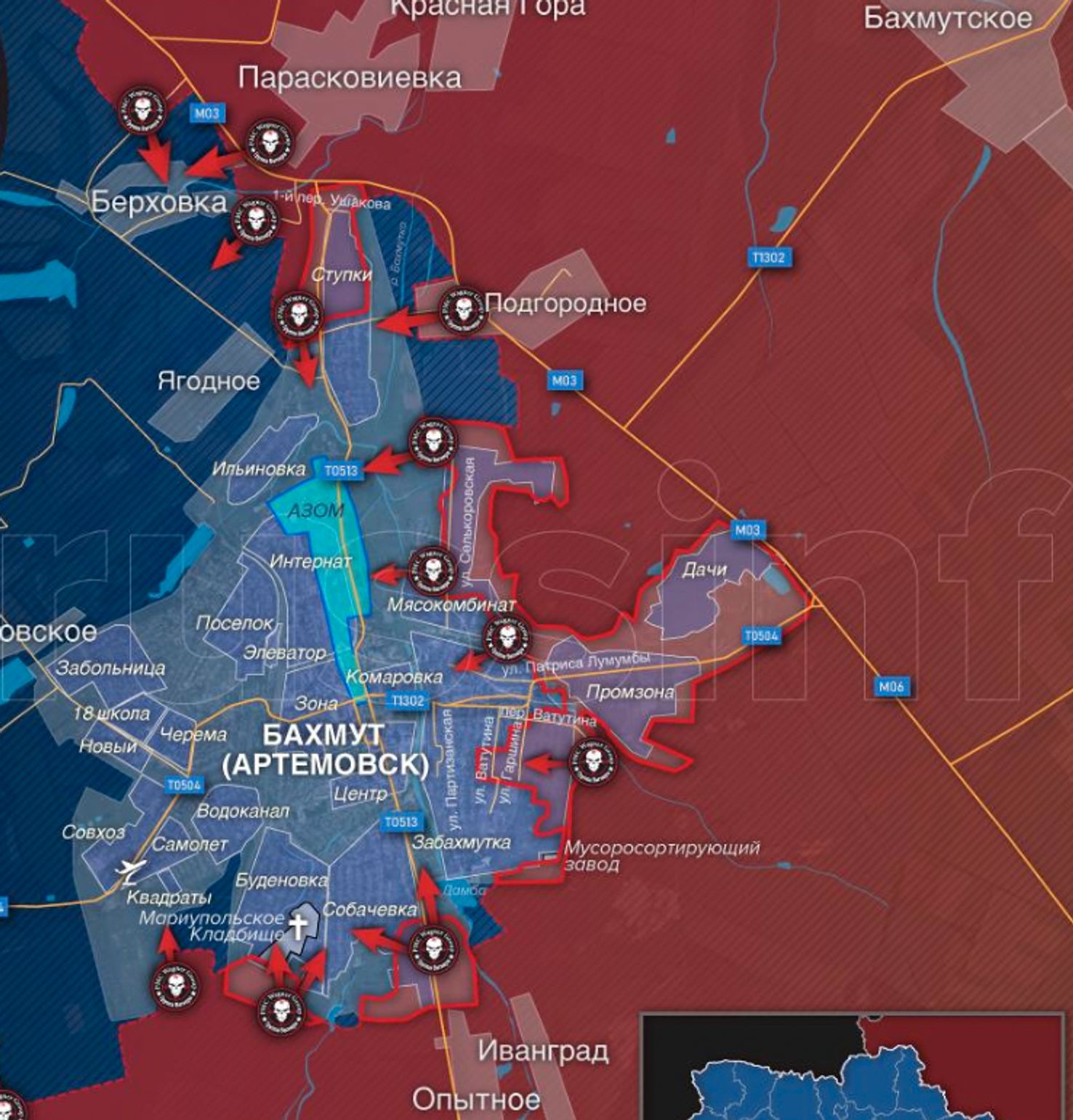 Населенный пункт Ягодное севернее Бахмута перешел под контроль ЧВК Вагнера, пишет пропагандистский Telegram-канал «Два майора». Генштаб ВСУ не сообщал о потере контроля над Ягодным. По данным канала, ж/д станция Ступки также занята штурмовиками ЧВК в результате боев. Однако OSINT-проект WarMonitor приводит данные о том, что к северу от Бахмута продолжаются тяжелые бои вокруг Ягодного и Берховки, попытки штурма отбиты.