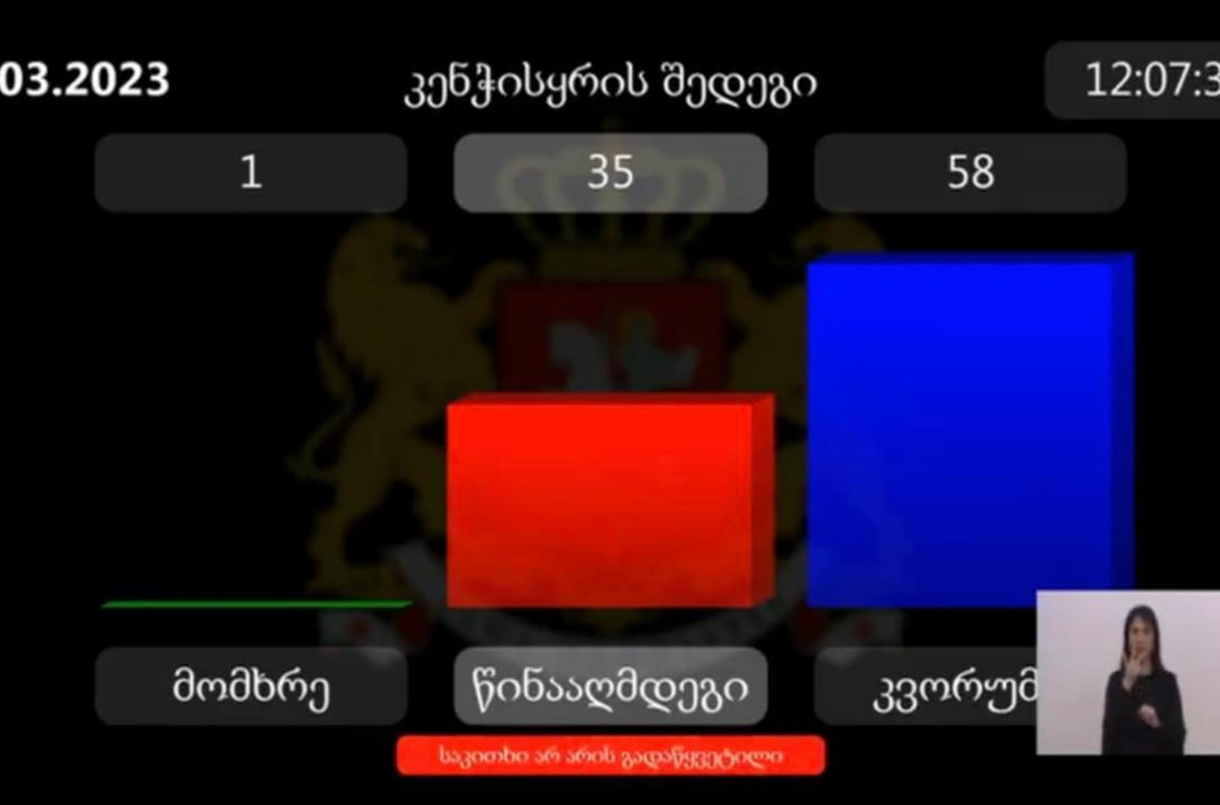 Парламент Грузии прекратил рассмотрение законопроекта об «иностранных агентах». Один депутат проголосовал за его рассмотрение, 35 выступили против.