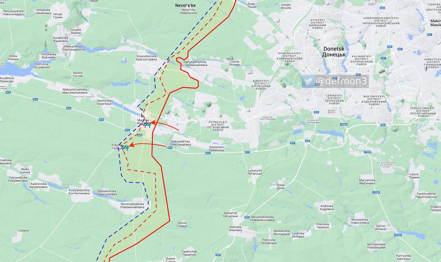Северо-западнее Авдеевки идут позиционные бои у железной дороги. После вылазки ВС РФ в Степовое украинские военнослужащие перекинули резервы и вытеснили российскую группировку за ж/д линию. Западнее ВС РФ ведут обстрел ВСУ в Ласточкино, Тоненьком и Северном.
