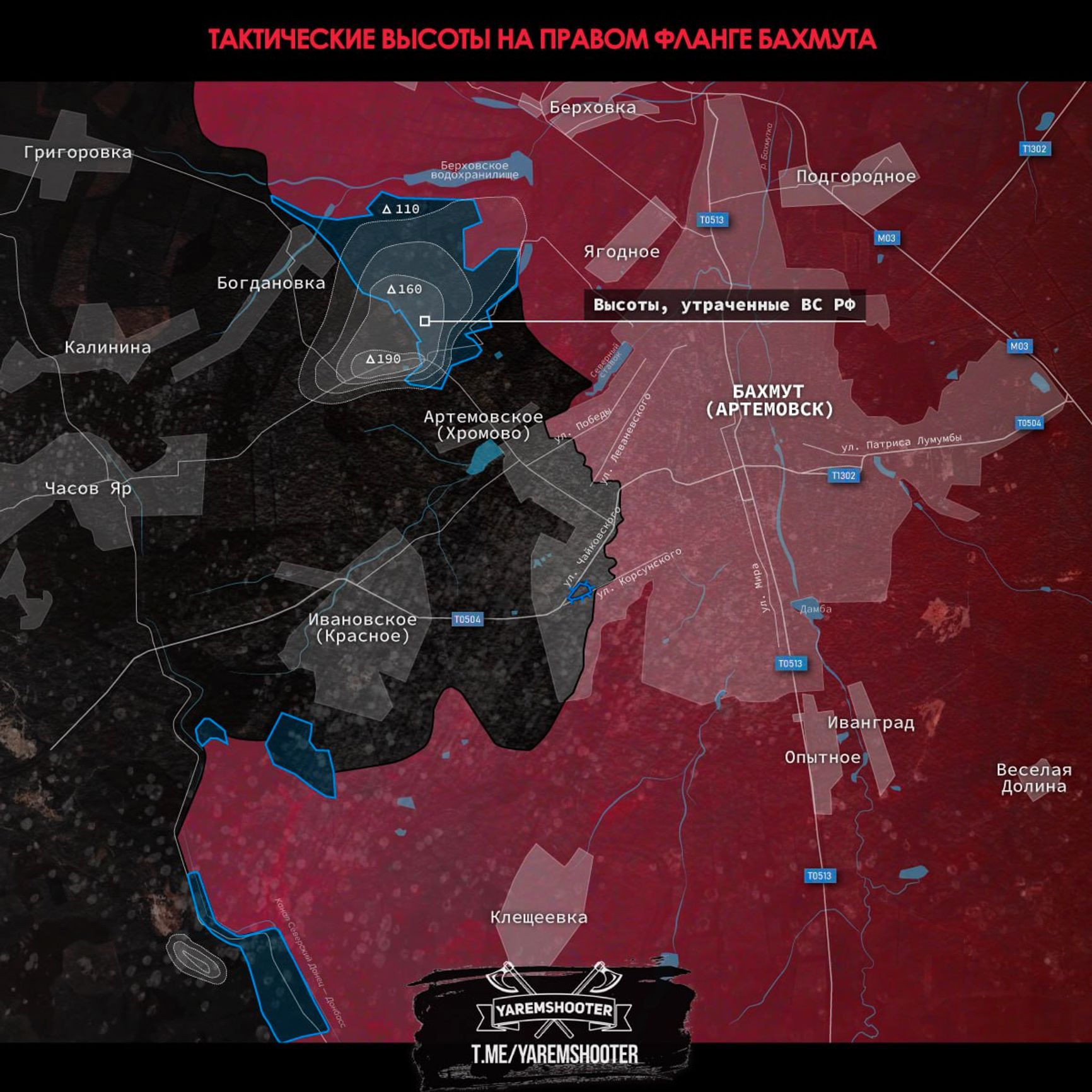 На карте, опубликованной в российском Z-канале «Военкор Ярем», можно видеть, какие высоты были потеряны россиянами.
