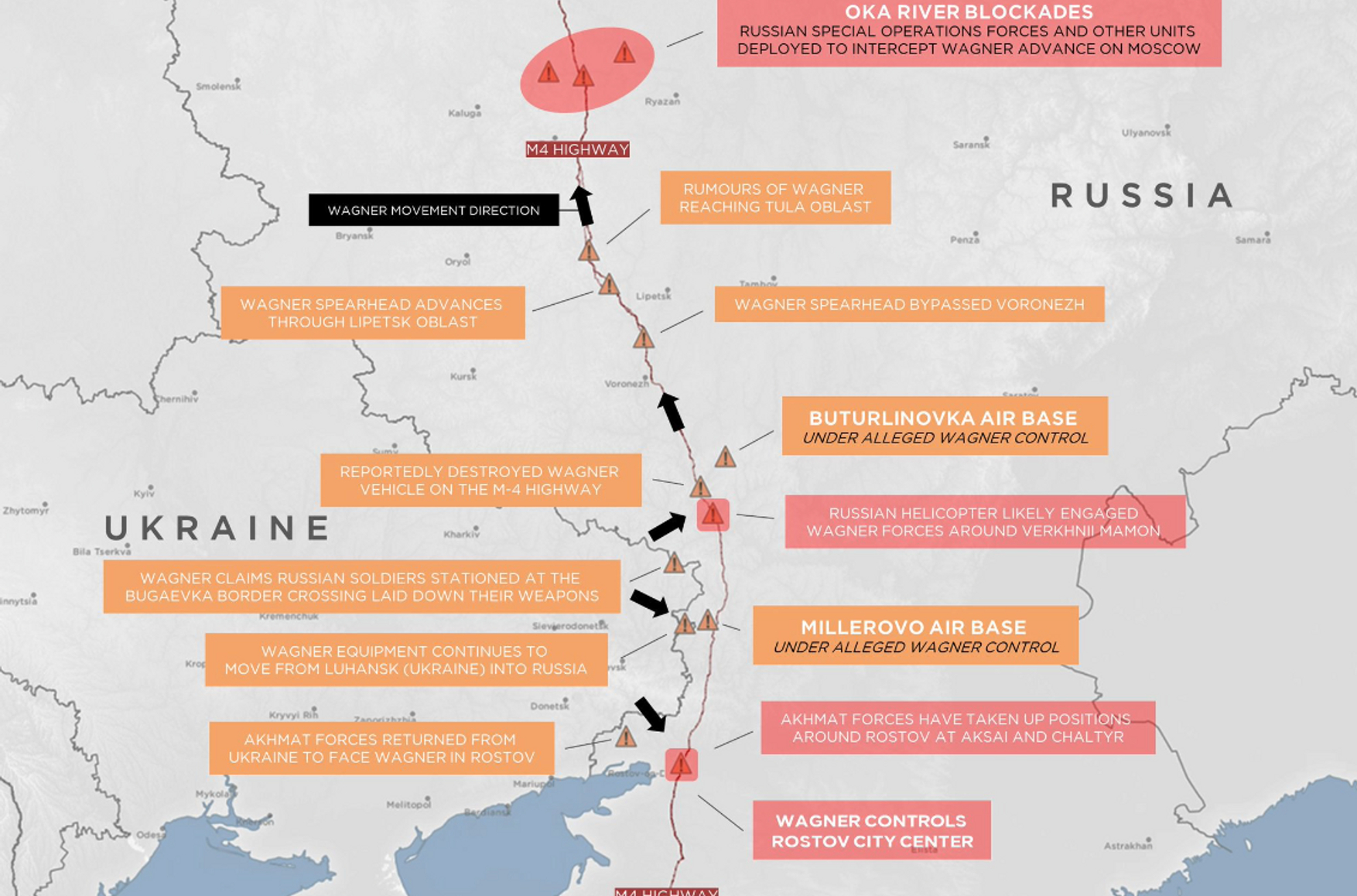 Весь день российские СМИ и Telegram-каналы следили за передвижением бойцов ЧВК Вагнера, которые взяли под контроль военные объекты в Ростове-на-Дону, Ростовской области и двинулись на Москву. В городах были слышны взрывы и выстрелы, на улицах заметили танки и БТРы, в Воронежской области в жилой двор прилетел снаряд. Помимо этого, военнослужащие российской армии разбомбили автомобильный мост в двух километрах от города Богучар. Сам Пригожин, против которого возбудили дело об организации военного мятежа, заявил, что не собирается являться с повинной по требованию Путина, ФСБ или «еще кого-нибудь». Однако вечером 24 июня пресс-служба Александра Лукашенко заявила, что белорусский лидер по согласованию с Владимиром Путиным провел переговоры с Пригожиным и заключил соглашение о начале «деэскалации» и остановки движения «вагнеровцев» в РФ: