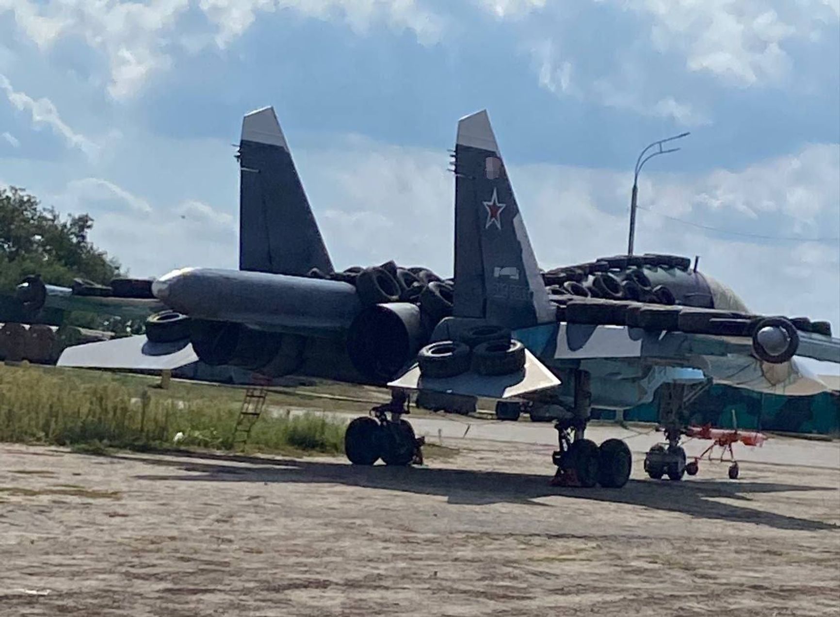 - Российские военные продолжают обкладывать покрышками самолеты — на этот раз истребители-бомбардировщики.