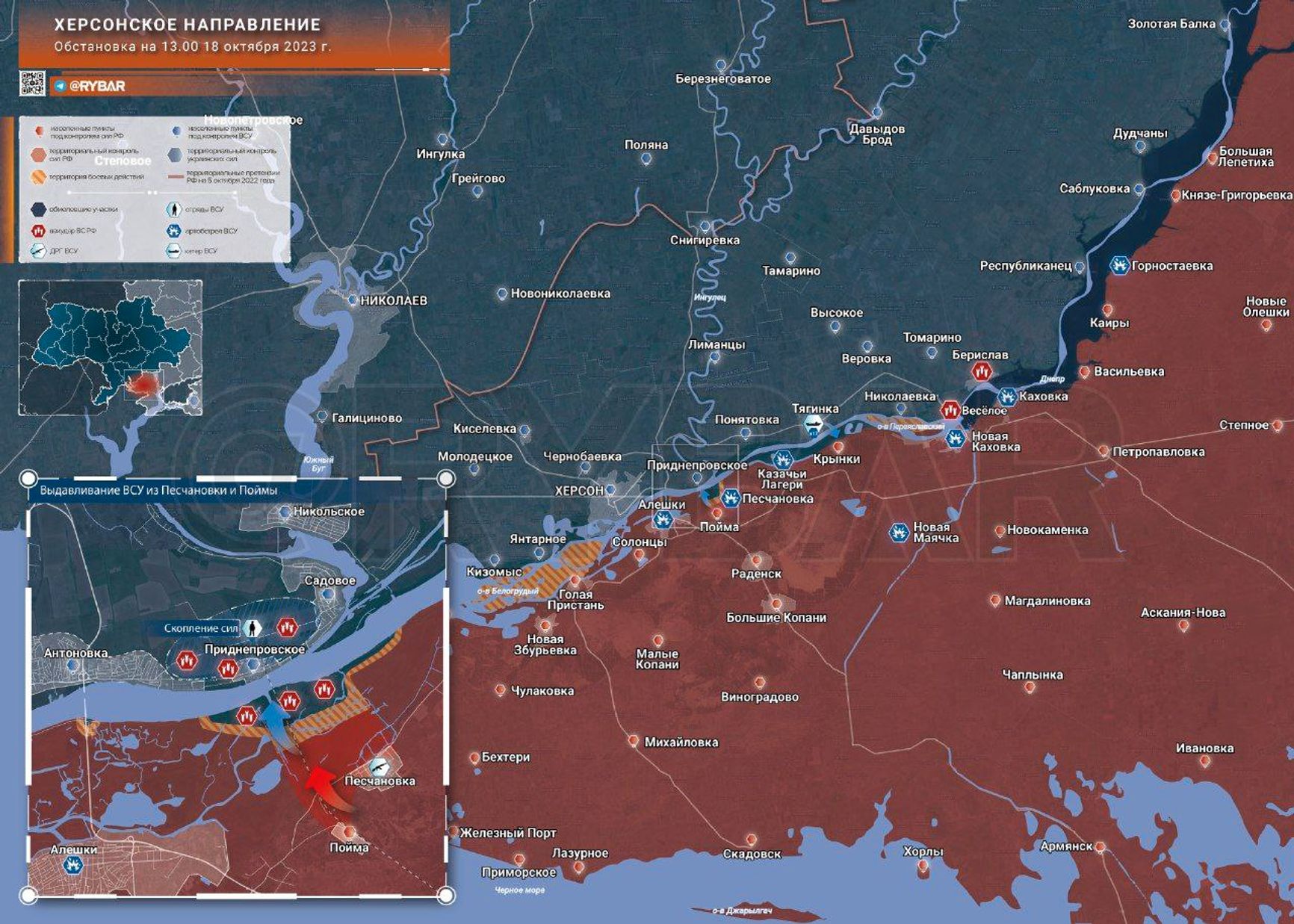 «Рыбарь» сообщает о высадке украинского десанта на левом берегу Днепра. По сведениям авторов канала, вечером 17 октября четыре штурмовых группы из ударной группировки «Катран» высадились возле железнодорожного моста на острове Алешкинский и совершали попытки продвинуться к Песчановке и Пойме. Позже к ним подошло подкрепление.