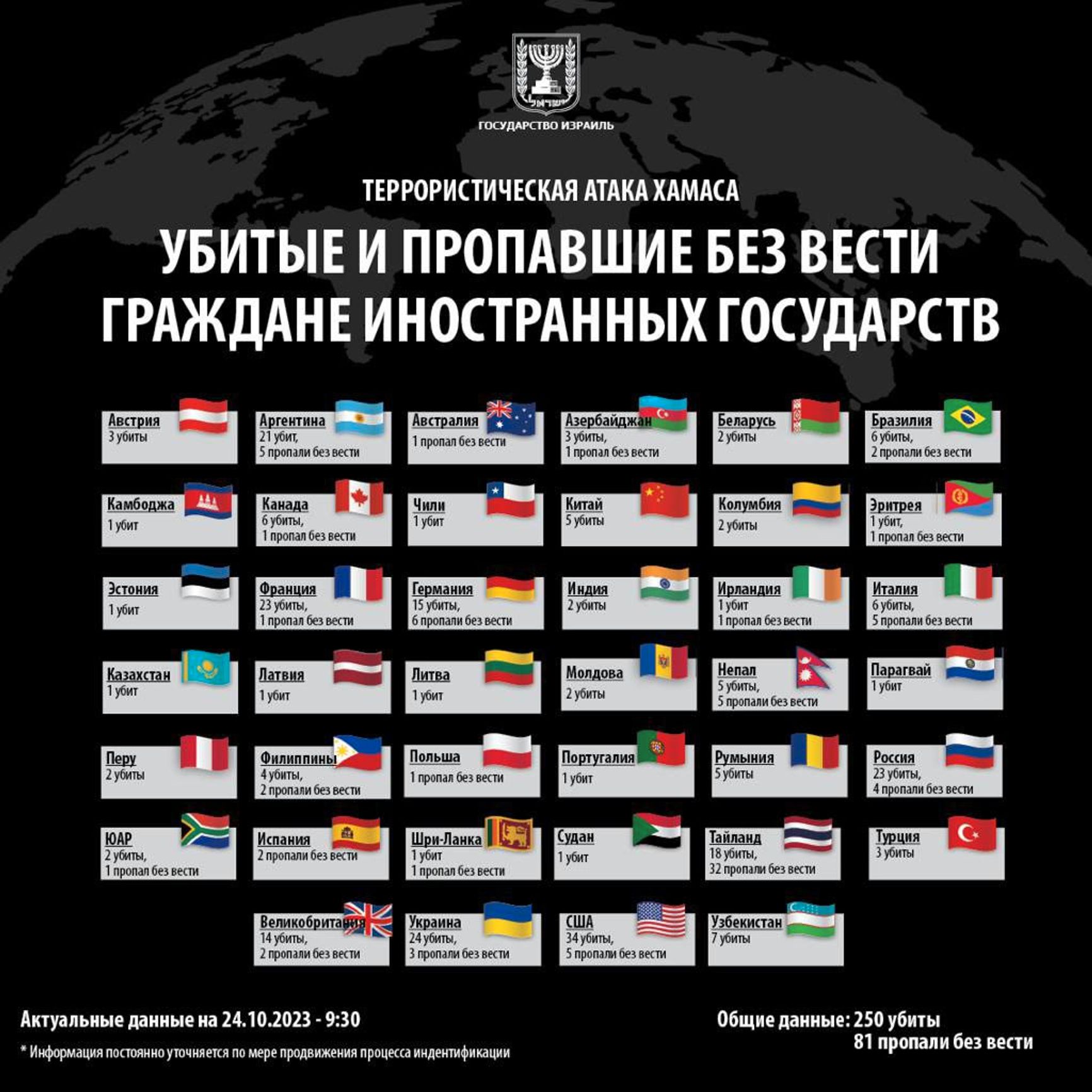 По данным ведомства, еще четверо россиян пропали без вести. Всего с момента обострения конфликта погибли 250 граждан из 40 государств, в том числе Беларуси, Казахстана, Узбекистана, Украины, США и Великобритании. В общей сложности пропал 81 иностранный гражданин.