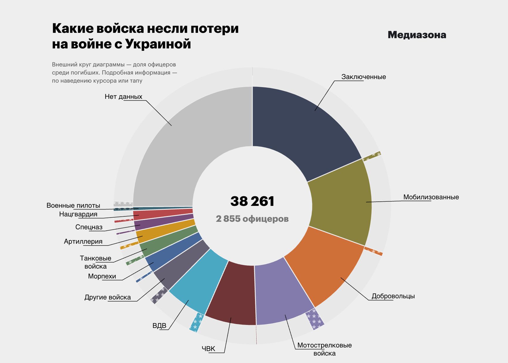 С начала полномасштабного вторжения в Украину с российской стороны погибли как минимум 38 261 человек, из них 7 072 — заключенные и 4 584 — мобилизованные. Их личности установили журналисты «Медиазоны» и Русской службы Би-Би-Си на основе сообщений в открытых источниках. Отмечается, что по состоянию на начало ноября 2023 года значительно выросло число военных, погибших в ходе боев под Авдеевкой. При этом к началу декабря стало расти количество некрологов о погибших в Херсонской области.