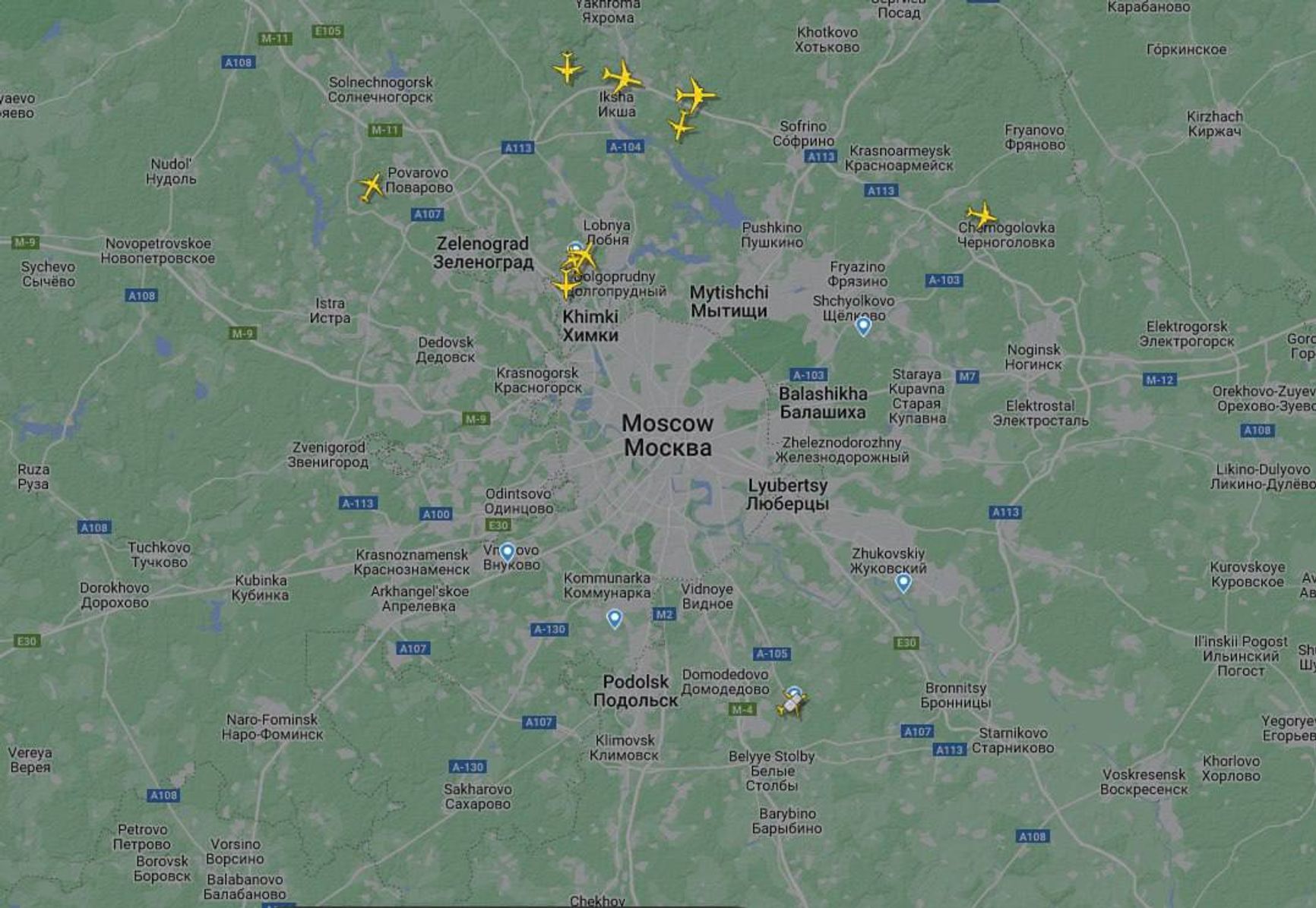 Ночью 23 августа столичные аэропорты Домодедово и Внуково временно также прекращали принимать и отправлять рейсы. Часть рейсов тогда перенаправили в аэропорт Шереметьево, расположенный к северо-западу от Москвы, часть самолетов ожидали возможности сесть в районе Рязани.