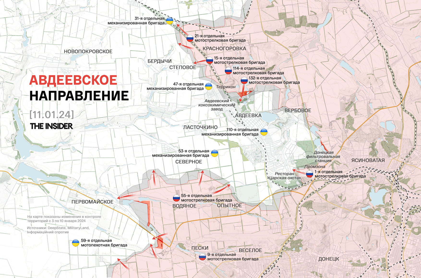 Наступательные действия, по сведениям Машовца, готовятся и на северном фасе авдеевского направления, где россияне, скорее всего, попытаются обойти Авдеевский коксохимический завод (АКХЗ) с северо-востока. Однако обозреватель выражает сомнения в успехе этих действий, так как пока не удалось ни сковать боем части, защищающие АКХЗ, ни взять село Бердычи, ни даже закрепиться в Степовом, поэтому «просачиваться» между узлами обороны ВСУ придется под плотным огнем с флангов.