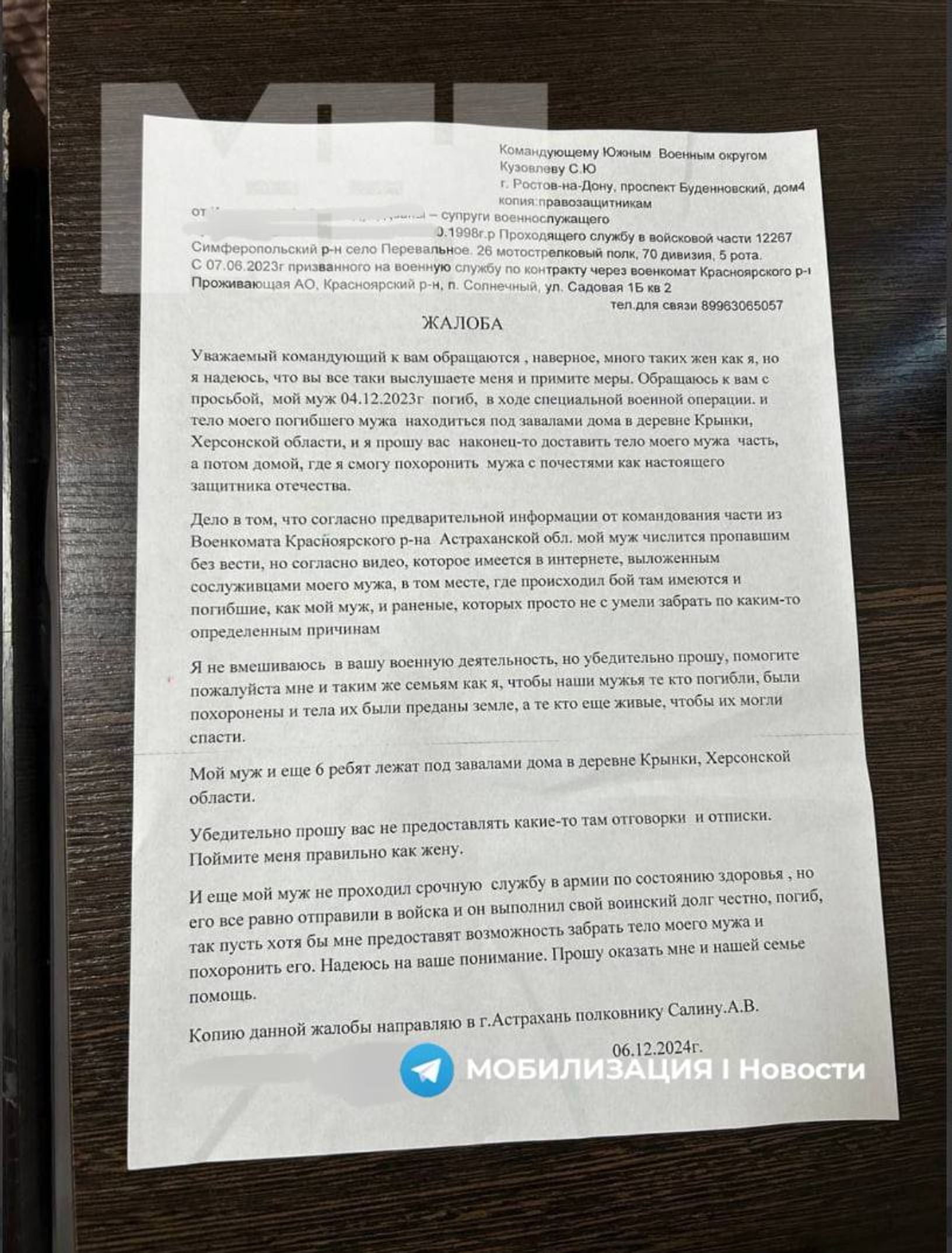 Telegram-канал «МОБИЛИЗАЦИЯ I Новости I Что делать?» публикует обращение вдовы одного из мобилизованных в штаб Южного военного округа с требованием вернуть тело ее мужа и его сослуживцев, которые погибли в населенном пункте Крынки в районе украинского плацдарма на левом берегу Днепра.
