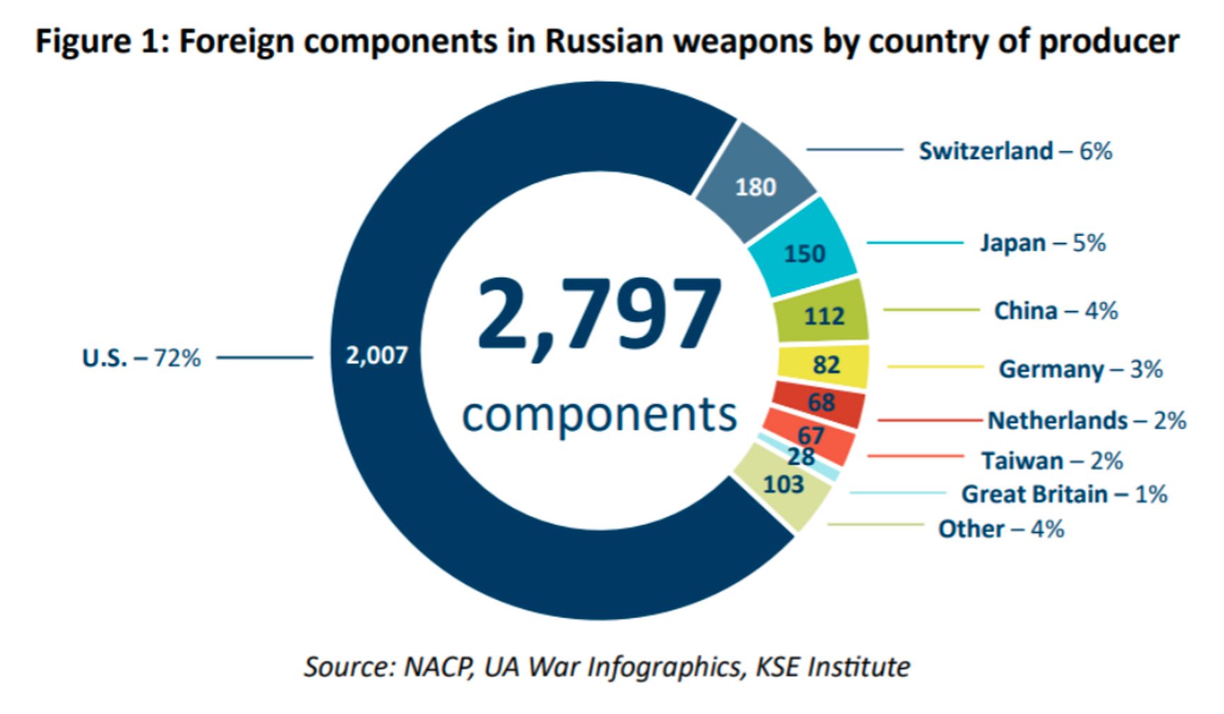 Киевская школа экономики и Международная экспертная группа Ермака-Макфола по санкциям против России выпустили доклад, посвященный проблемам контроля за импортом российскими компаниями продукции военного назначения, а также критически важных компонентов и материалов. В докладе анализируются почти 2800 элементов иностранного происхождения в российских вооружениях, обнаруженных в захваченных или найденных на поле боя в Украине образцах, больше 70% из них приходится на изделия производителей из США.