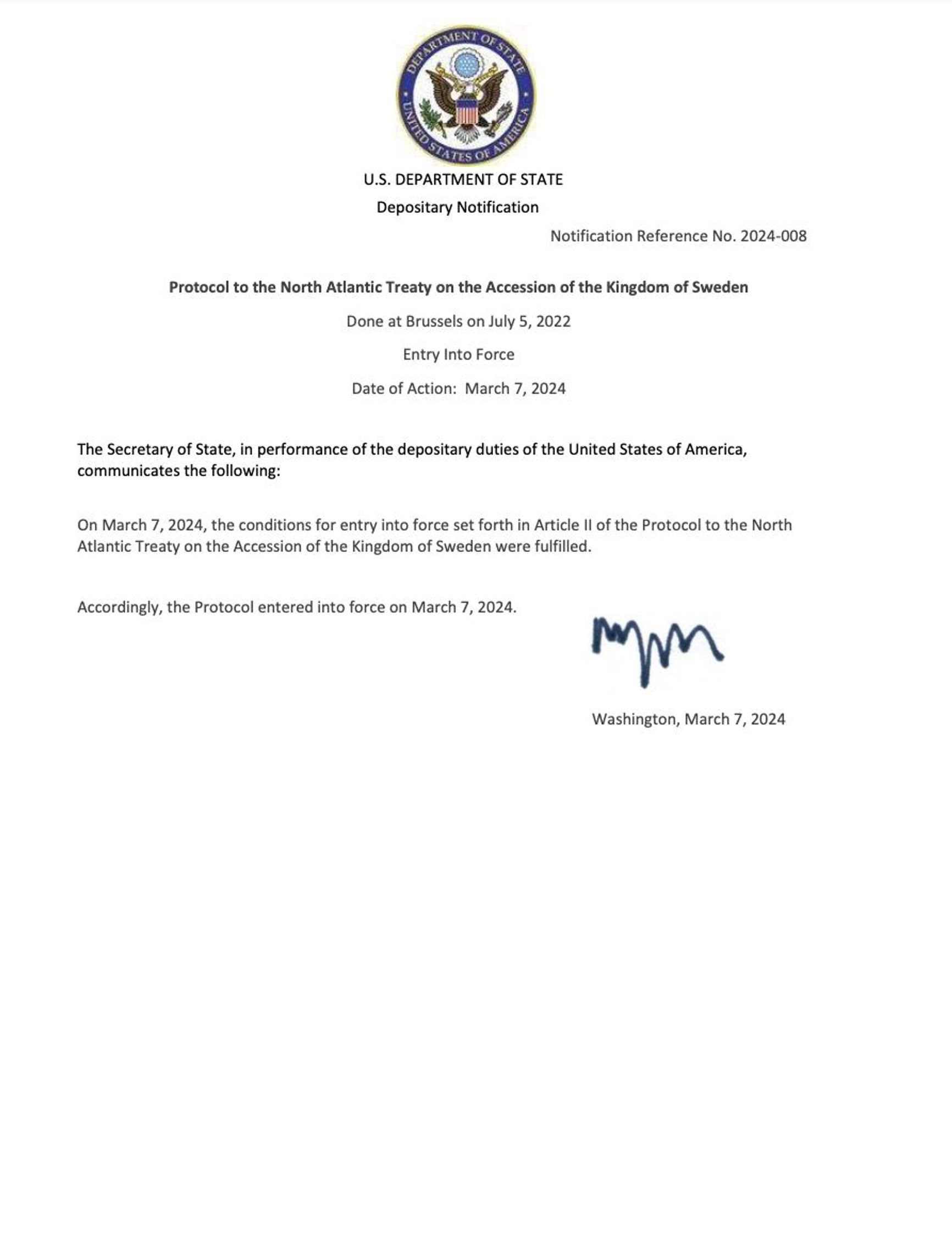 Швеция официально вступила в НАТО, сообщает Госдепартамент США. Скандинавская страна официально стала 32 членом военного альянса.