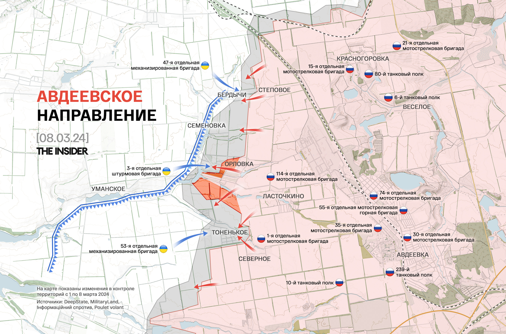 DeepState сообщает, что в последние дни россияне не прекращают давление западнее Авдеевки на линии Бердычи Орловка Тоненькое, пытаясь вытеснить ВСУ из этих населенных пунктов. В Тоненьком противника удалось выбить из домов, где до этого российские военные вешали флаги. По данным проекта, в настоящее время полным ходом идет строительство линий обороны, однако на упомянутом рубеже их не успели возвести вовремя, за что украинские бойцы «платят собственной кровью и жизнями».