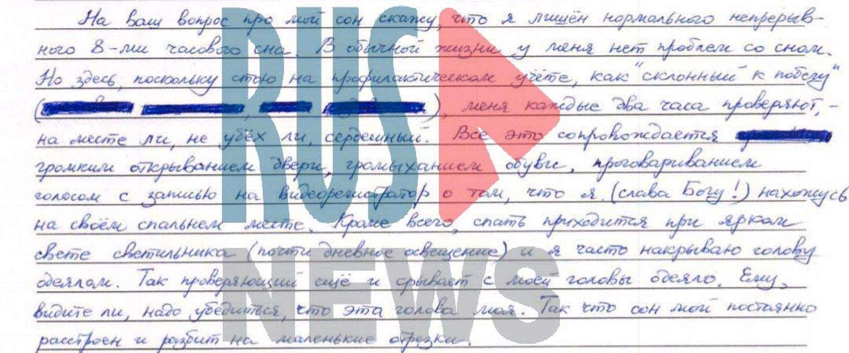 В своем новом письме Горинов рассказал, что его поставили на учет как «склонного к побегу», поэтому его проверяют даже ночью каждые два часа. При этом проверяющие шумят и срывают с его головы одеяло, которым он накрывается от яркого света.