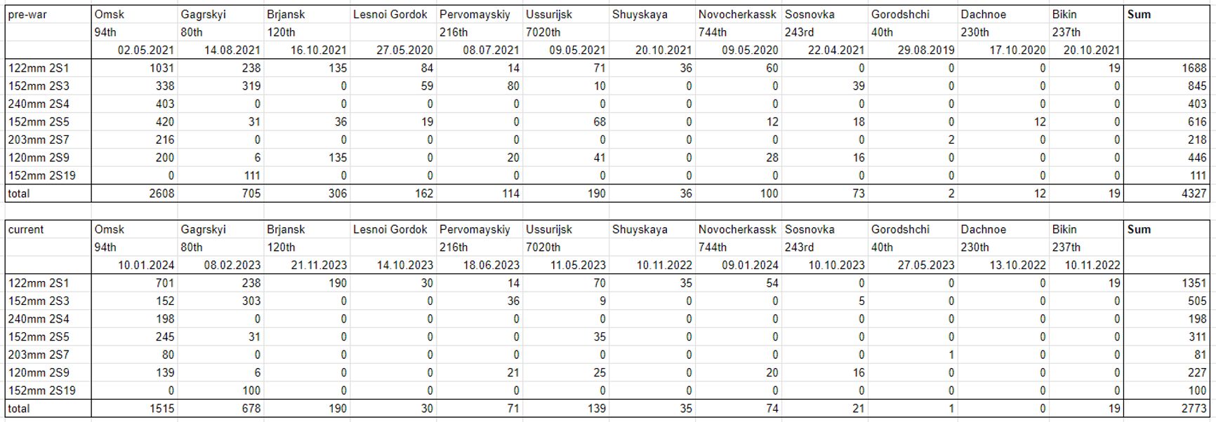 Исследователь под ником high_marsed подсчитал количество российских САУ на базах хранения по спутниковым снимкам. Согласно его информации, с начала войны с хранения были сняты 1554 самоходки, в то время как к февралю 2022 года там находилось 4327 единиц. К тому же определенная часть остающихся используется в качестве доноров запчастей.