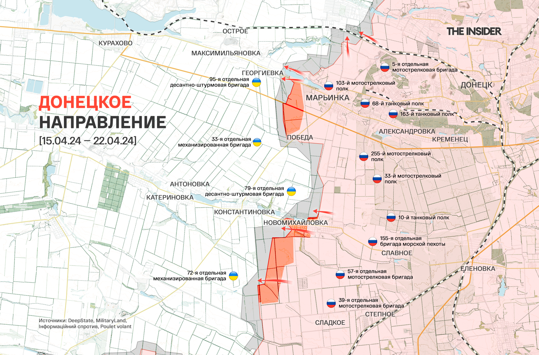 В российских источниках сообщается о полном захвате поселка Новомихайловка (к югу от Марьинки), в качестве подтверждения приводится соответствующая фотография.